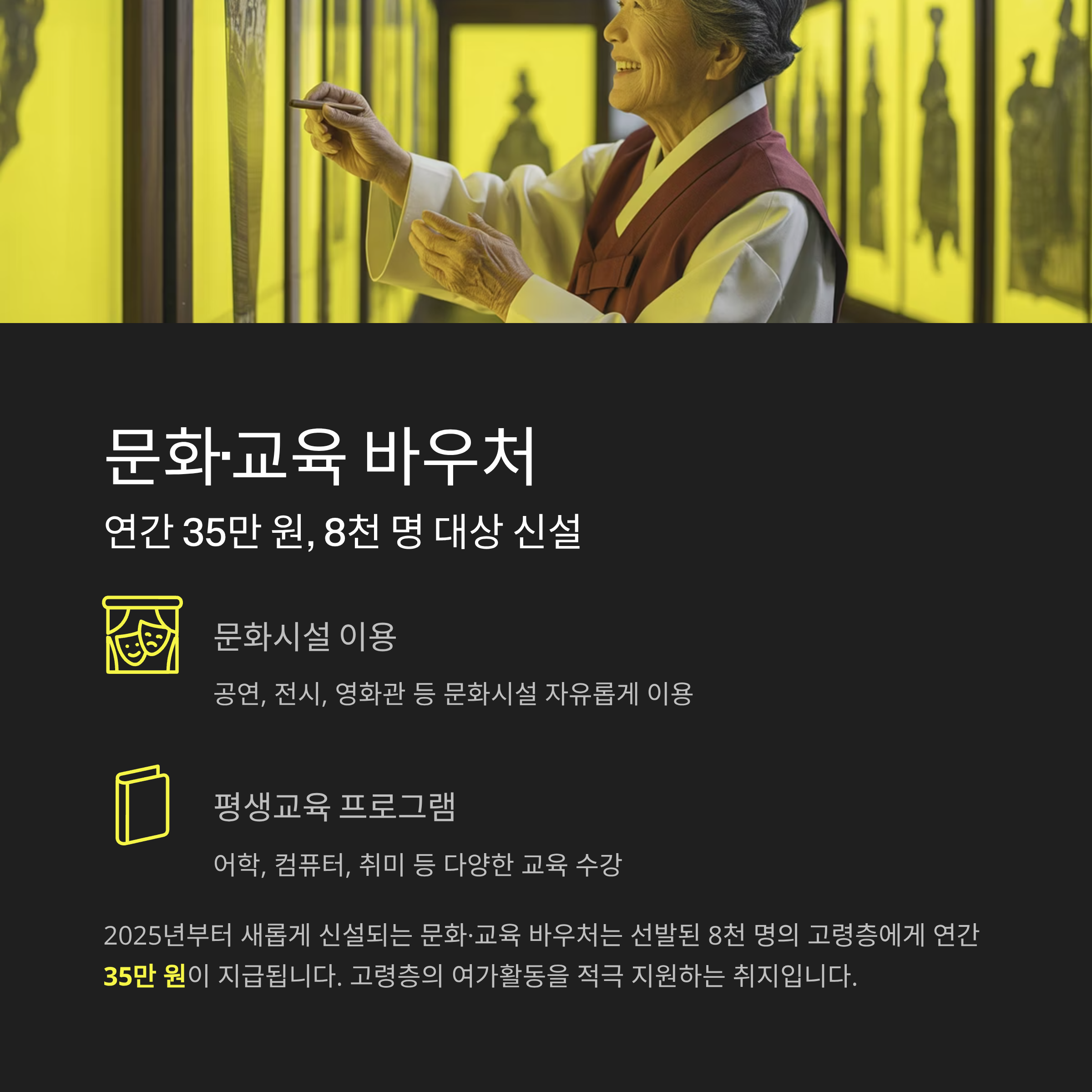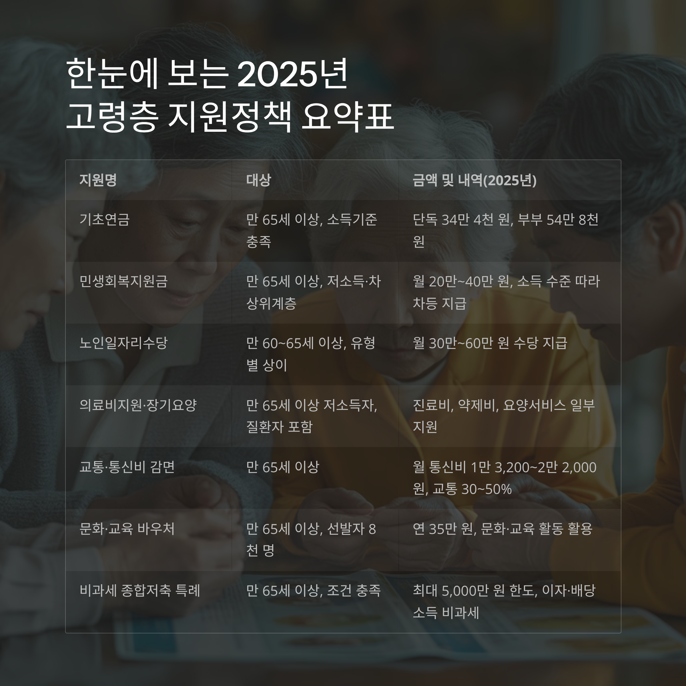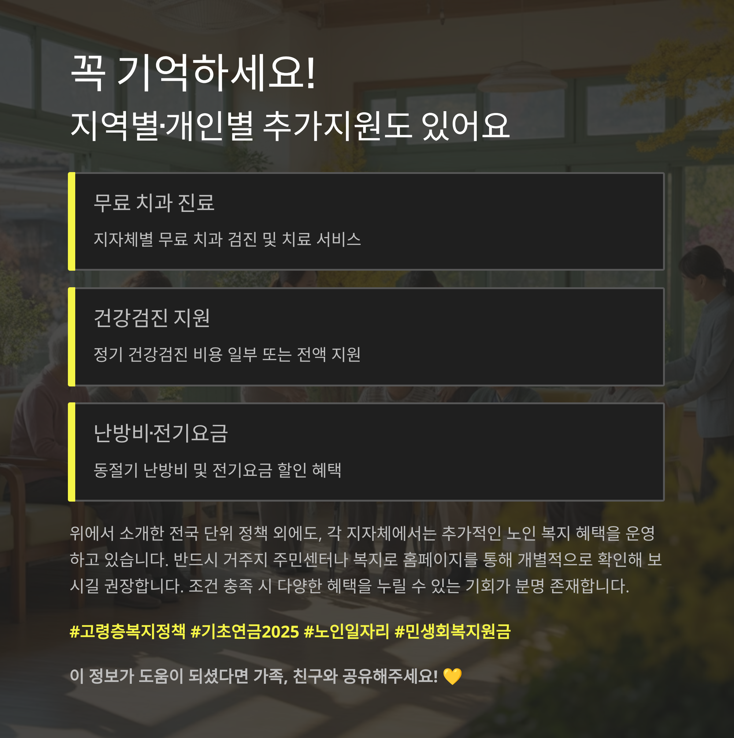 | 2025년 65세 이상 고령층을 위한 주요 지원정책 총정리 (0) | 2025.10.10 |