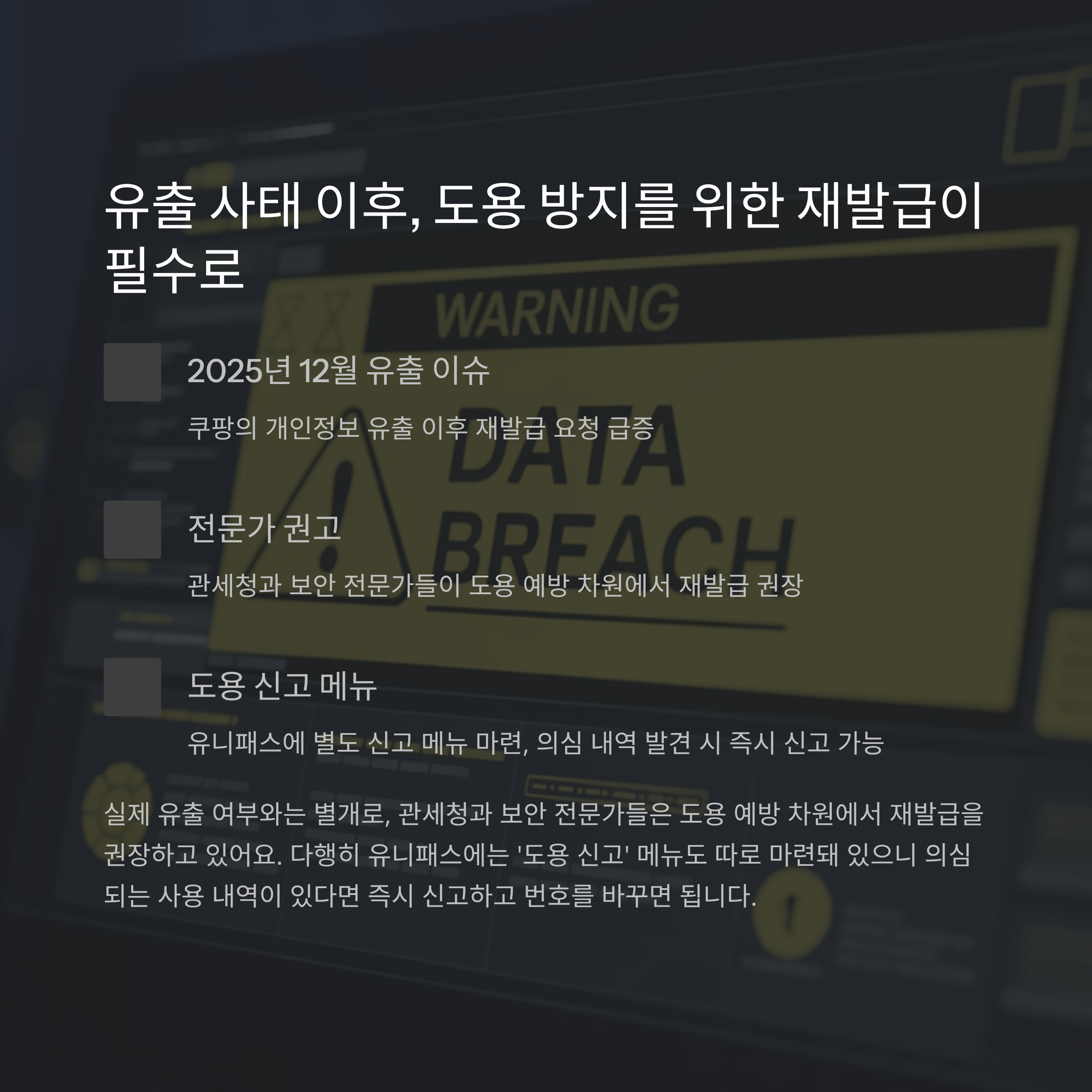 실제 유출 여부와는 별개로, 관세청과 보안 전문가들은 도용 예방 차원에서 재발급을 권장하고 있어요.