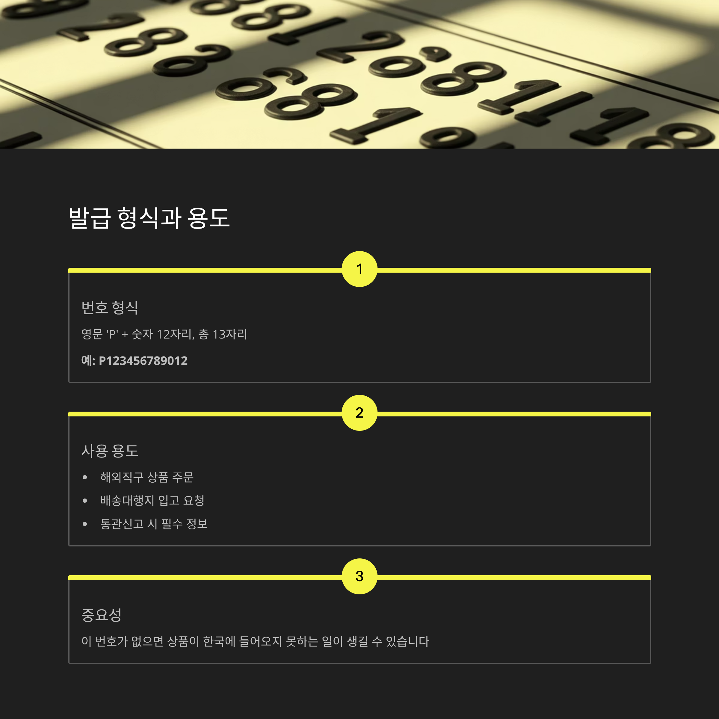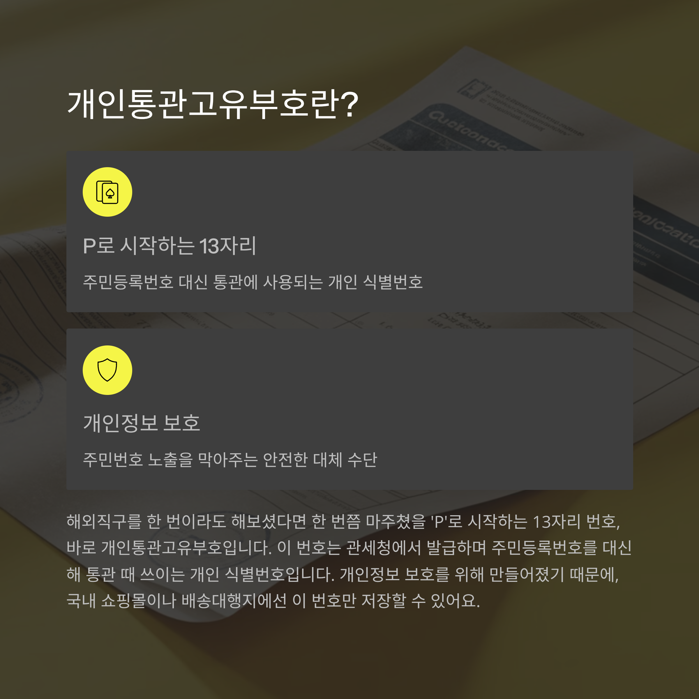 해외직구를 한 번이라도 해보셨다면 한 번쯤 마주쳤을 'P'로 시작하는 13자리 번호, 바로 개인통관고유부호입니다.
