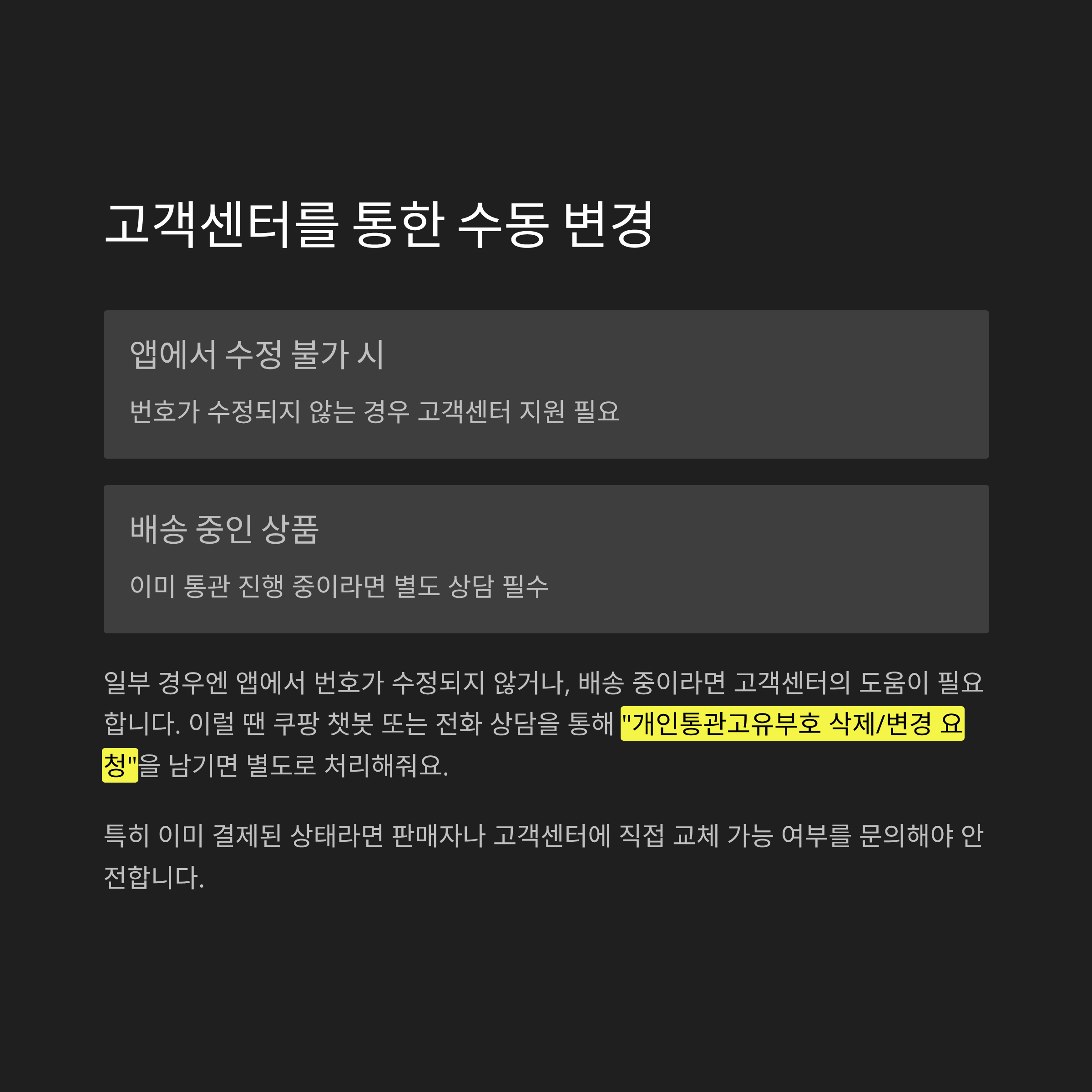 “개인통관고유부호 삭제/변경 요청”을 남기면 별도로 처리해줘요.