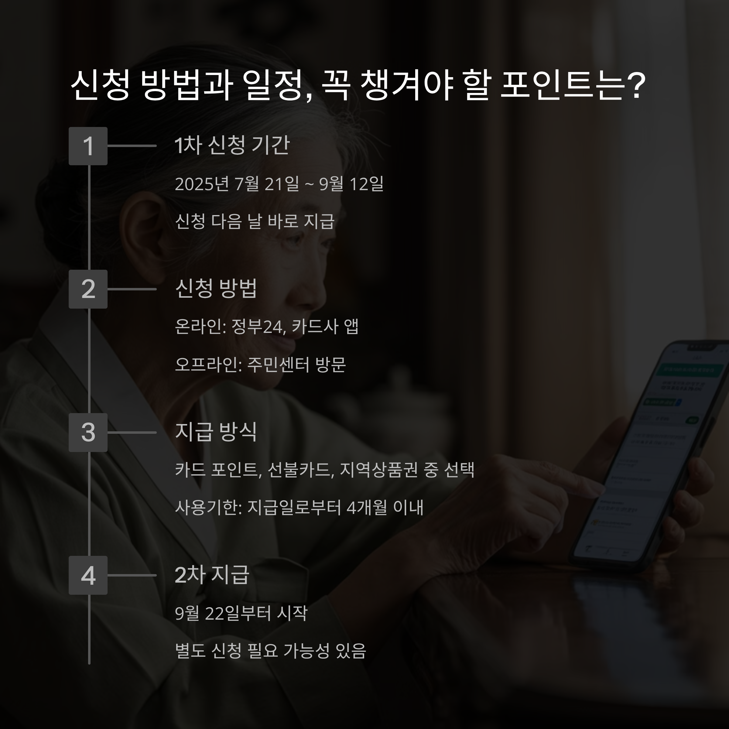세대주 여부, 대리 신청 가능 조건, 신청 시 필요한 서류, 지급 금액 차등 기준, 사용 기한 및 사용처 제한 사항까지 꼼꼼히 확인하셔야 합니다.