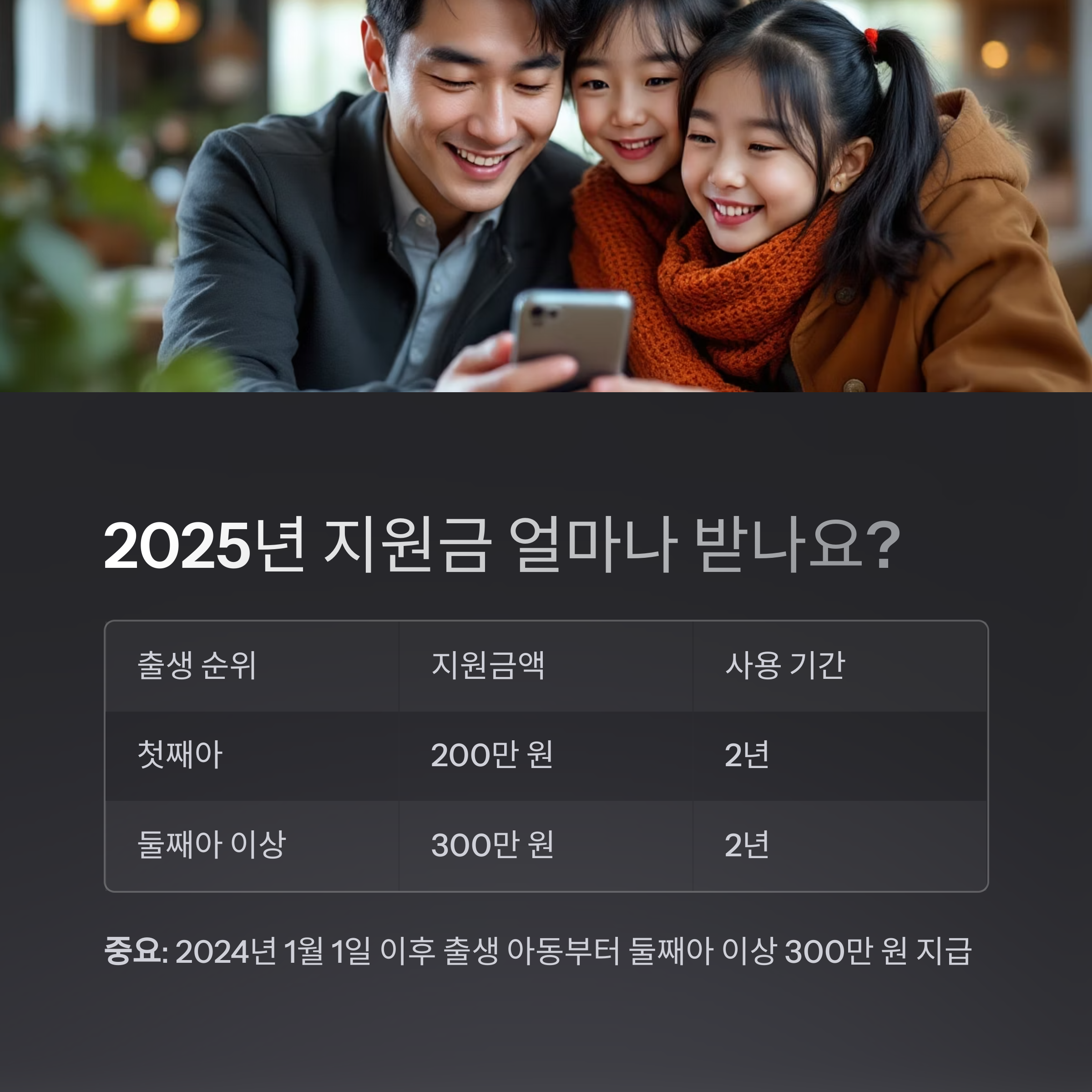 2025년 현재 둘째아 이상에 대한 300만 원 지원과 2년 사용기간은
