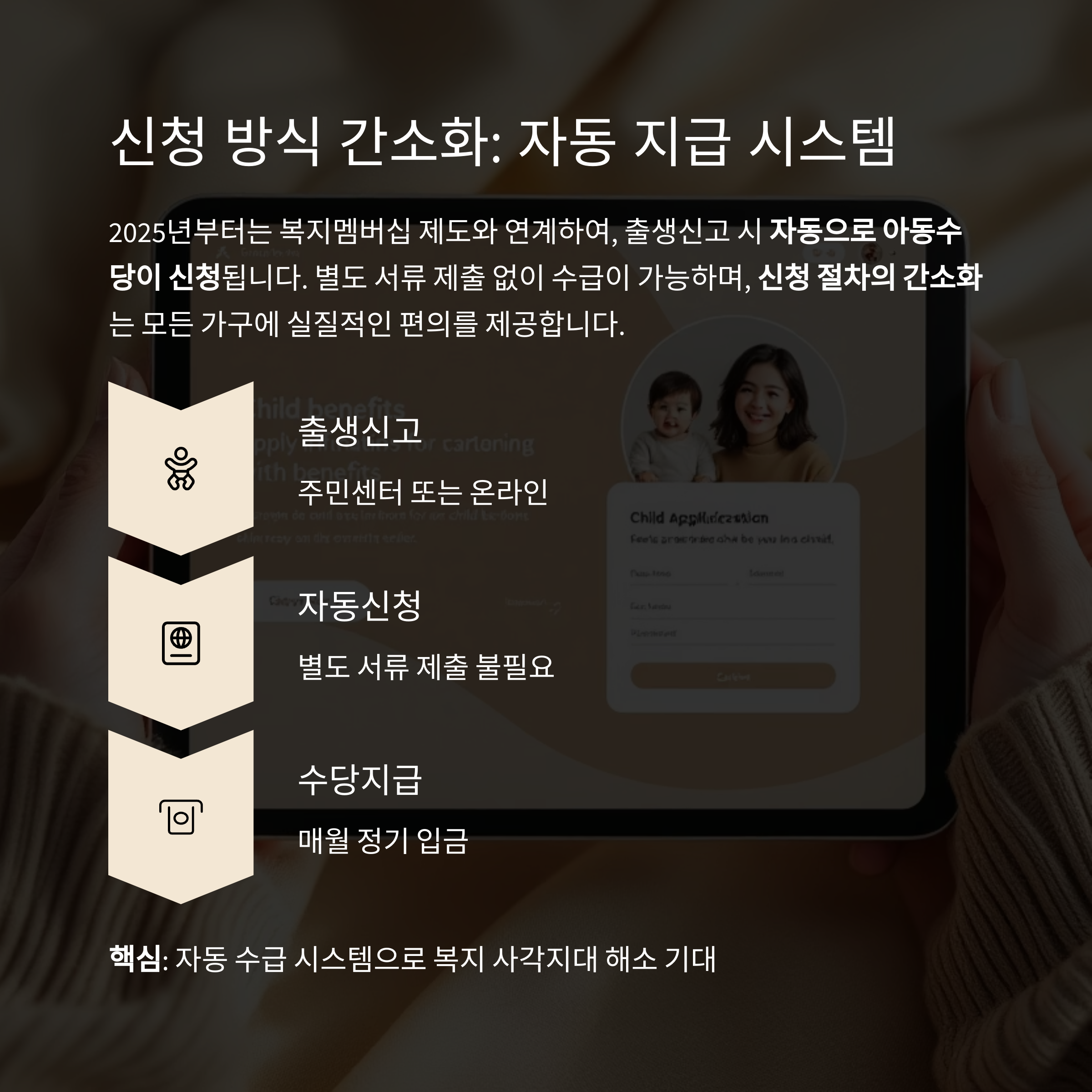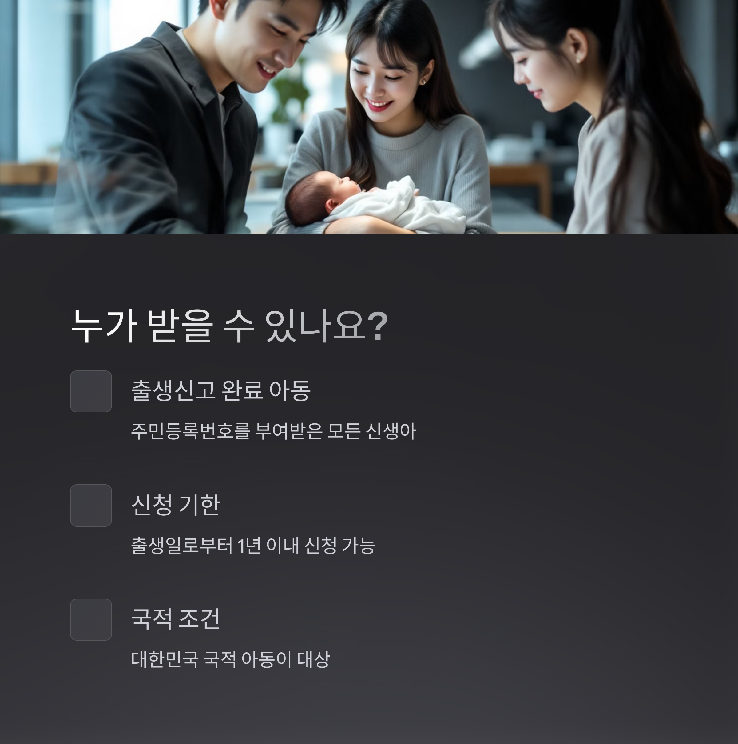 모든 대한민국 국적의 신생아가 대상이지만, 신청 시기와 조건을 반드시 확인해야 합니다.