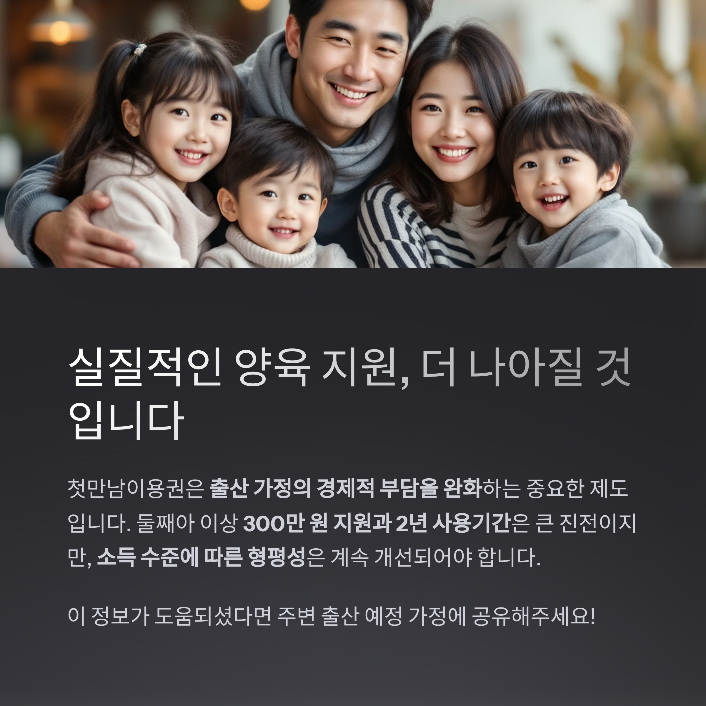 | 둘째아 이상 | 300만 원 | 국민행복카드 포인트 지급 | 2년 |