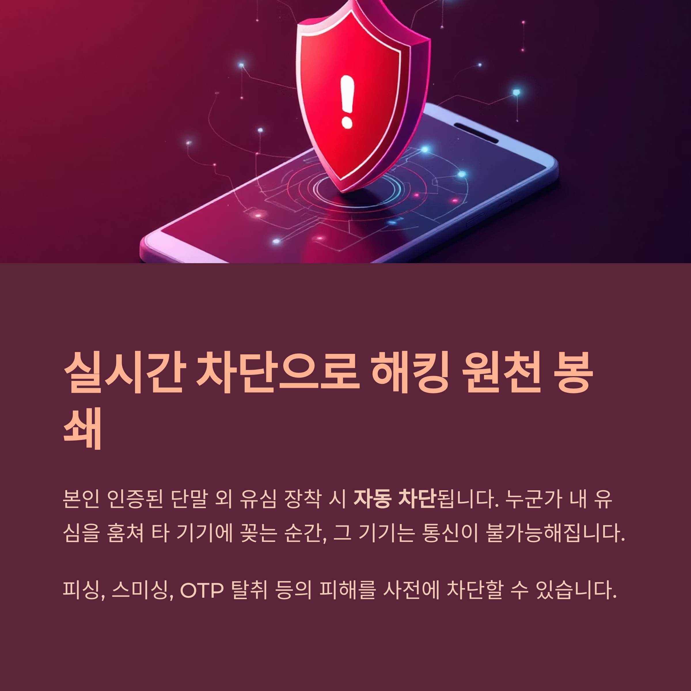 이 실시간 차단 기능 덕분에 피싱, 스미싱, OTP 탈취 등의 피해를 사전에 차단할 수 있습니다.