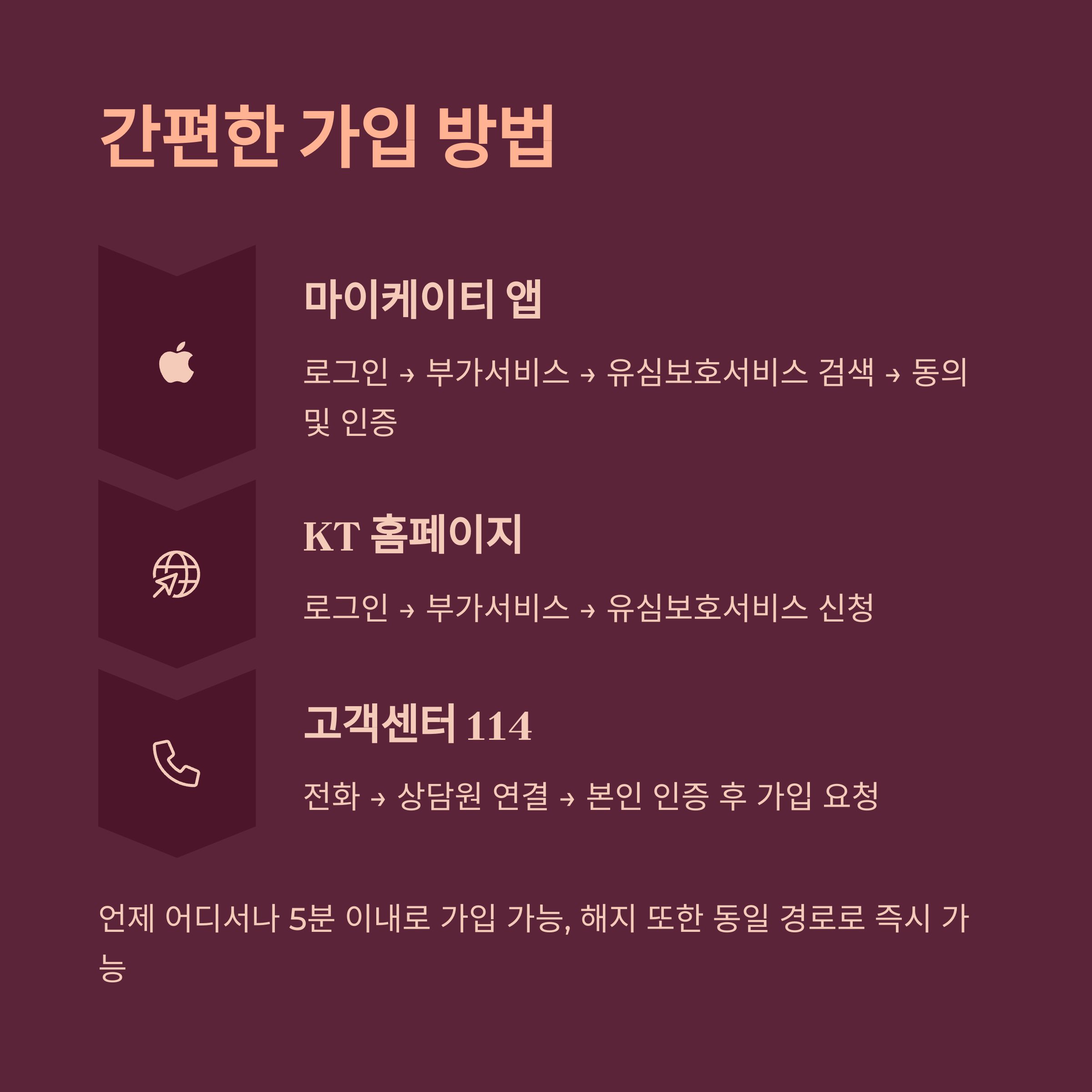 | 마이케이티 앱 | 로그인 → 부가서비스 → 유심보호서비스 검색 → 동의 및 인증 |