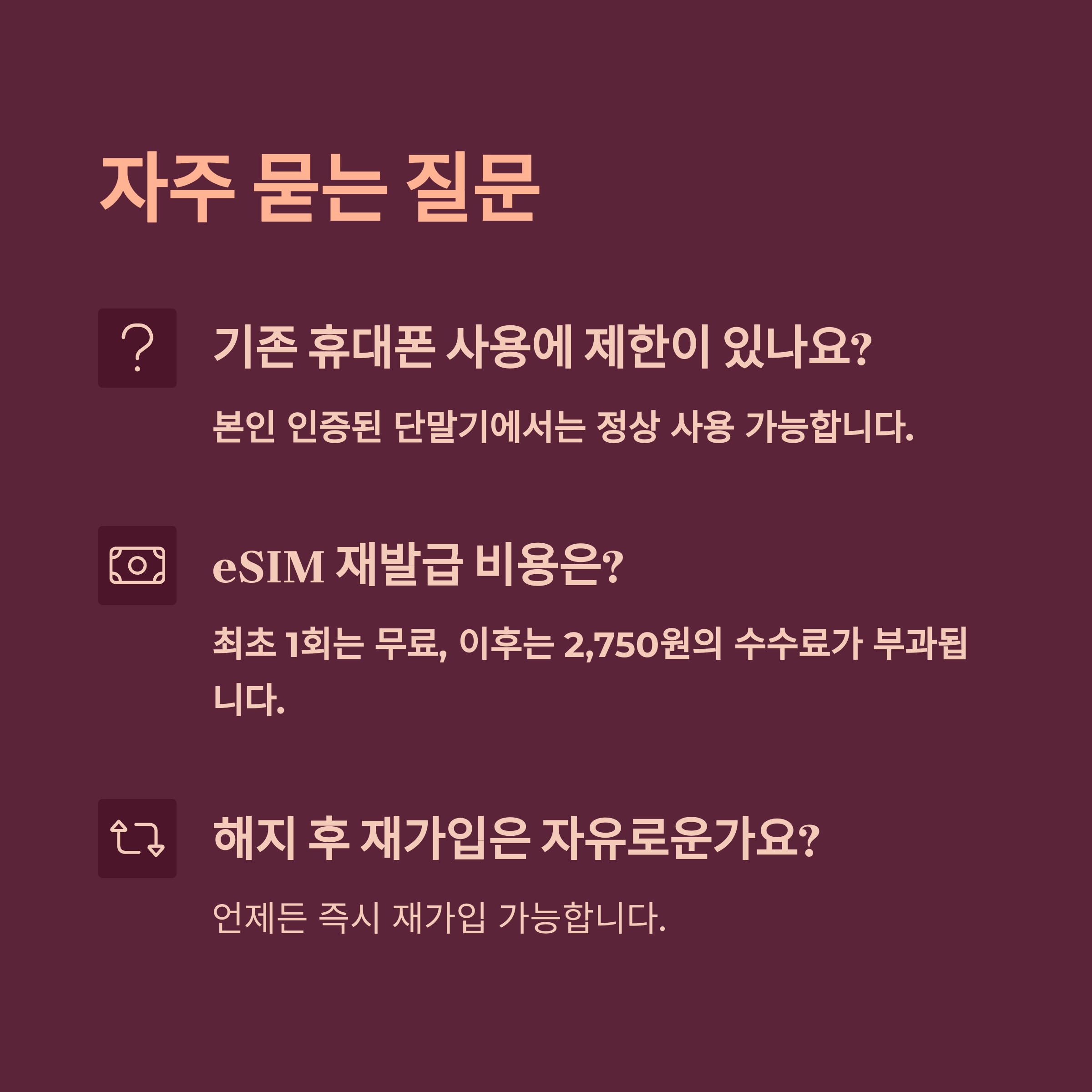 | USIM → eSIM 변경 | 재가입 필수, QR코드 재발급 필요 |
