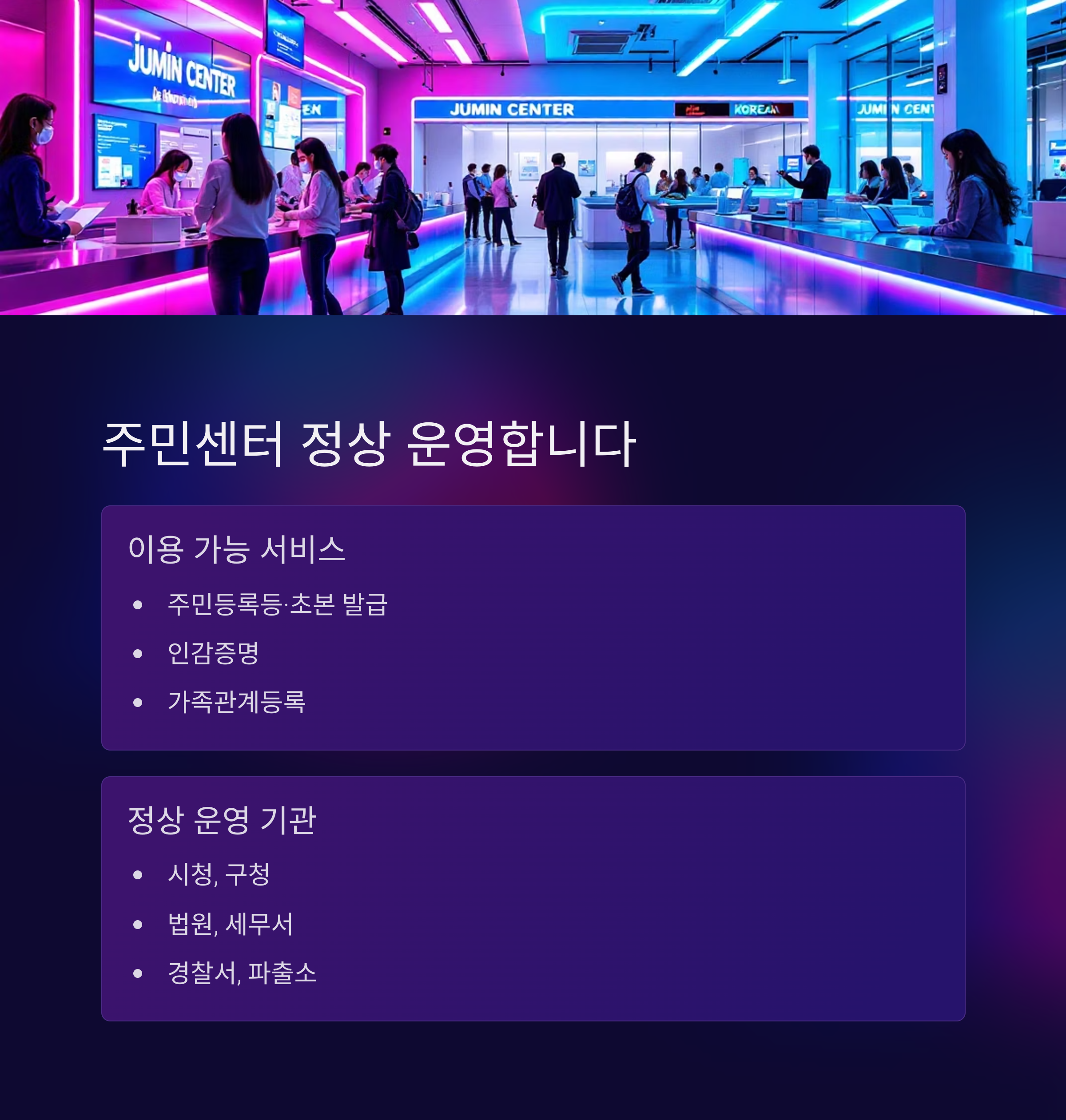 | 주민센터 | 정상 운영 | 모든 민원 가능 |