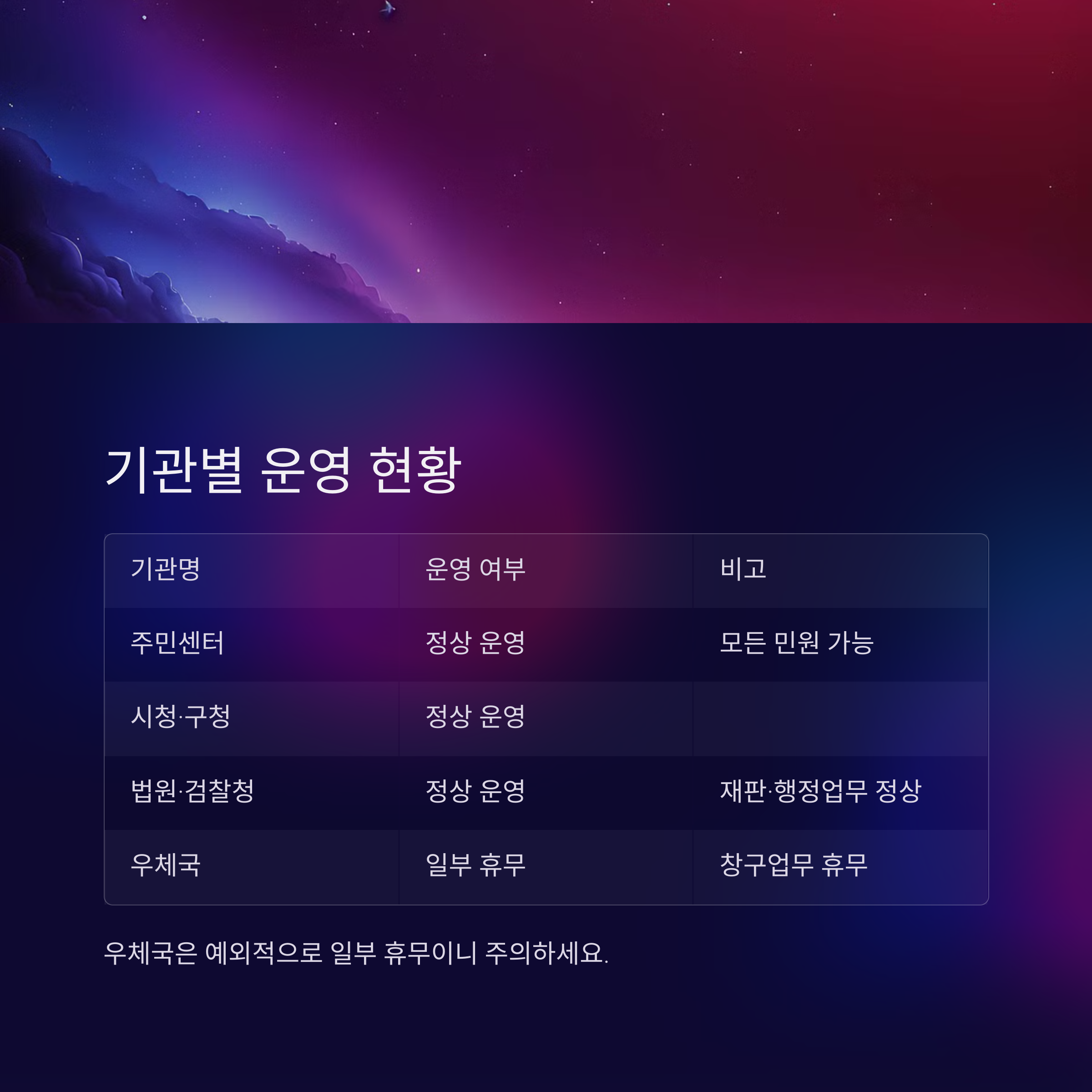 | 법원·검찰청 | 정상 운영 | 재판·행정업무 정상 진행 |