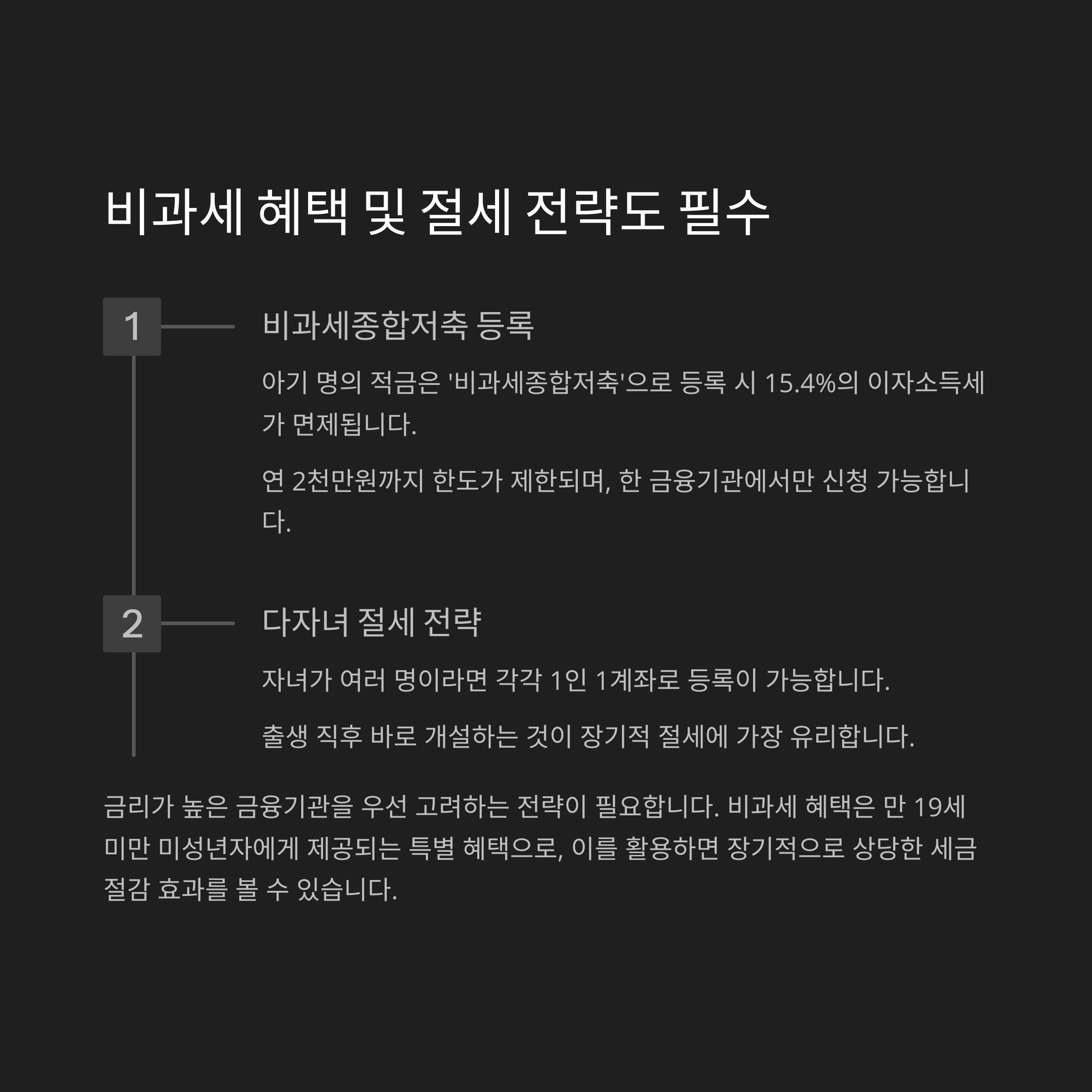 아기 명의로 개설한 적금은 '비과세종합저축'으로 등록 시 15.4%의 이자소득세가 면제됩니다.