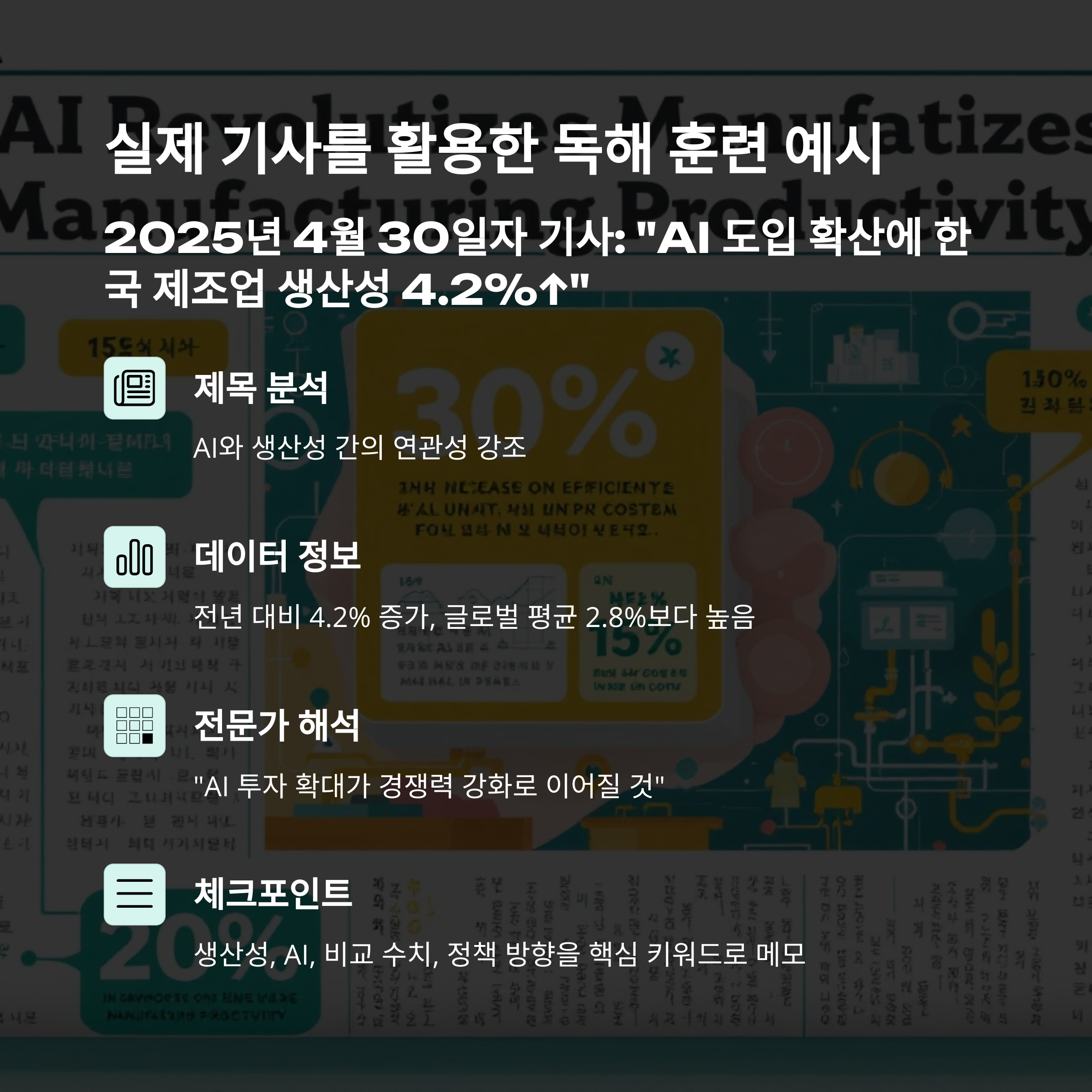 매일 10분이라도 꾸준히 제목, 데이터 중심으로 읽는 습관이 실력의 핵심입니다.