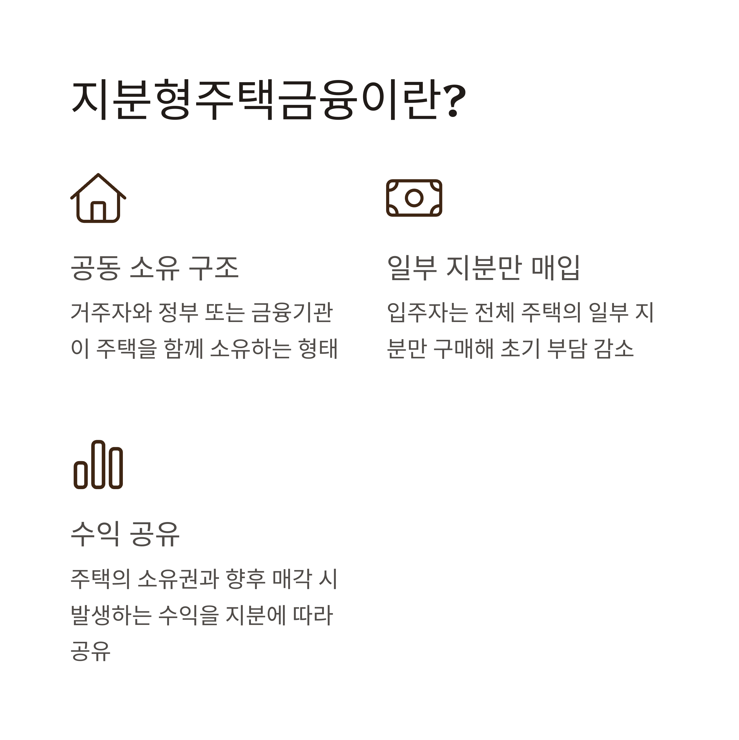 지분형주택금융은 말 그대로 주택의 소유권을 구매자와 정부 또는 금융기관이 공동으로 나누어 소유하는 형태입니다.