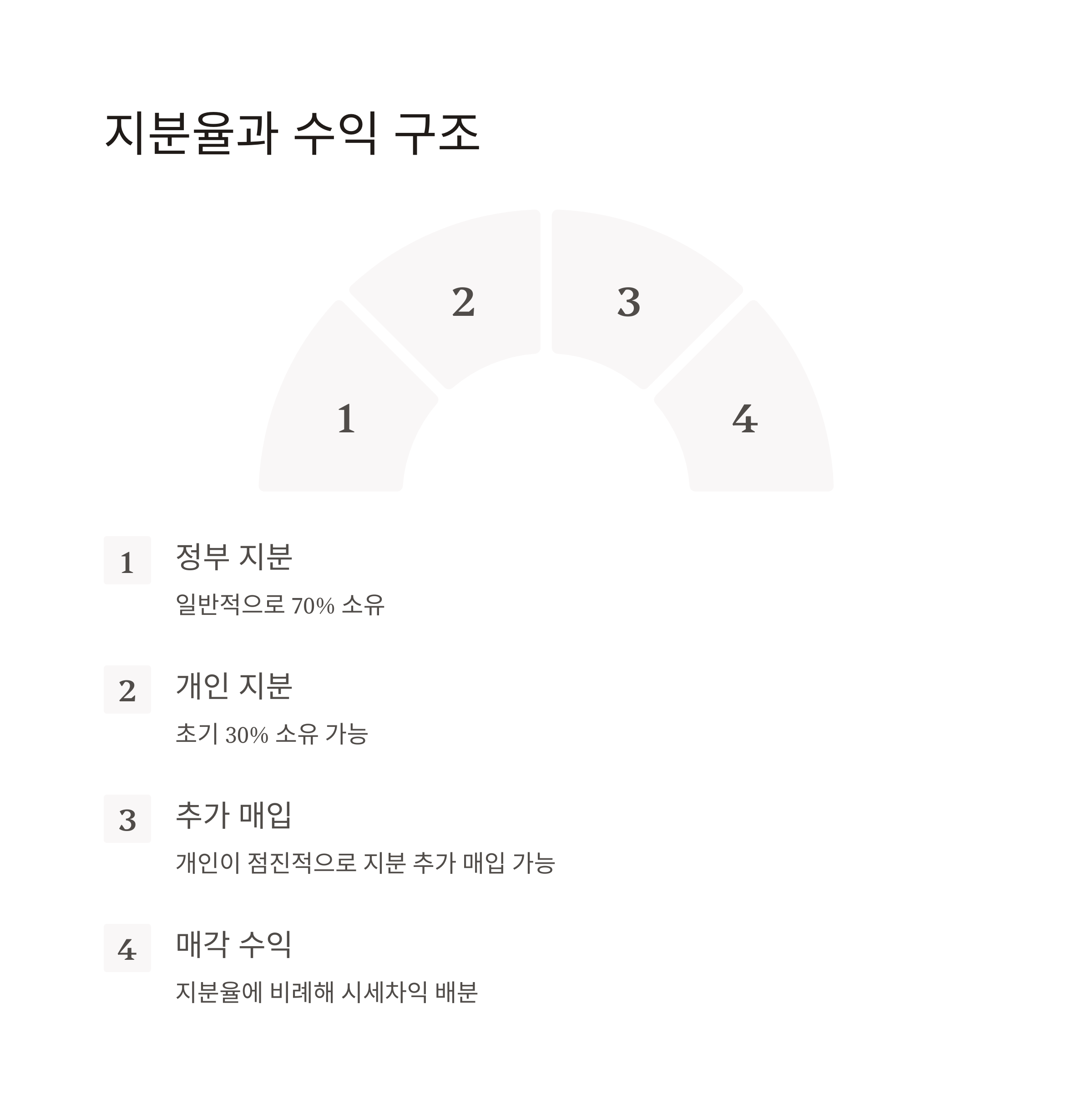 예를 들어, 집값 상승 시 공공 지분에서 수익이 발생하더라도 개인은 자신의 지분만큼만 수익을 가져갈 수 있는 구조입니다.