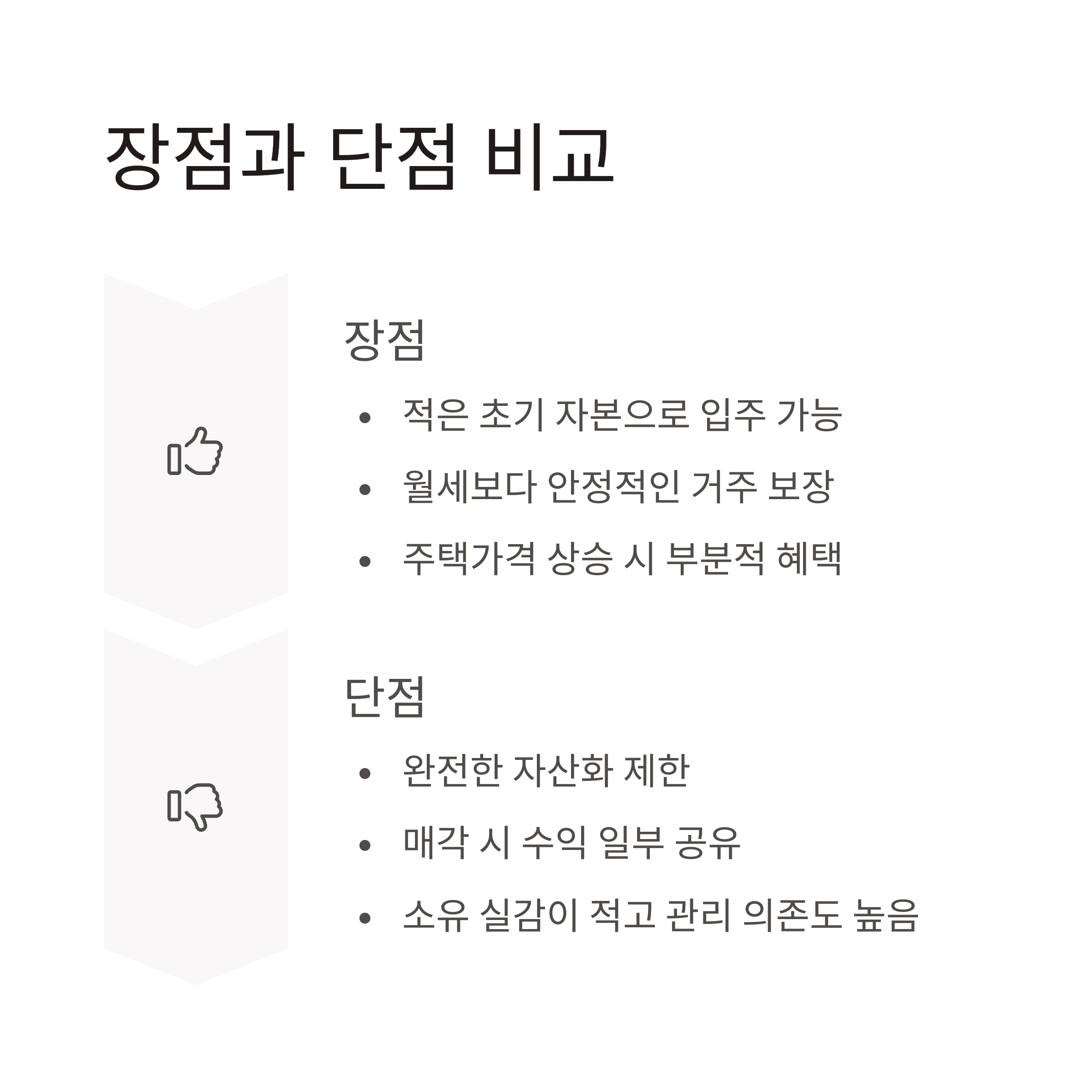 그러나 단점도 존재합니다. 예를 들어, 수익 발생 시 배분 구조의 복잡성, 매각 시 제약, 주거 안정성 측면의 불안 등입니다.