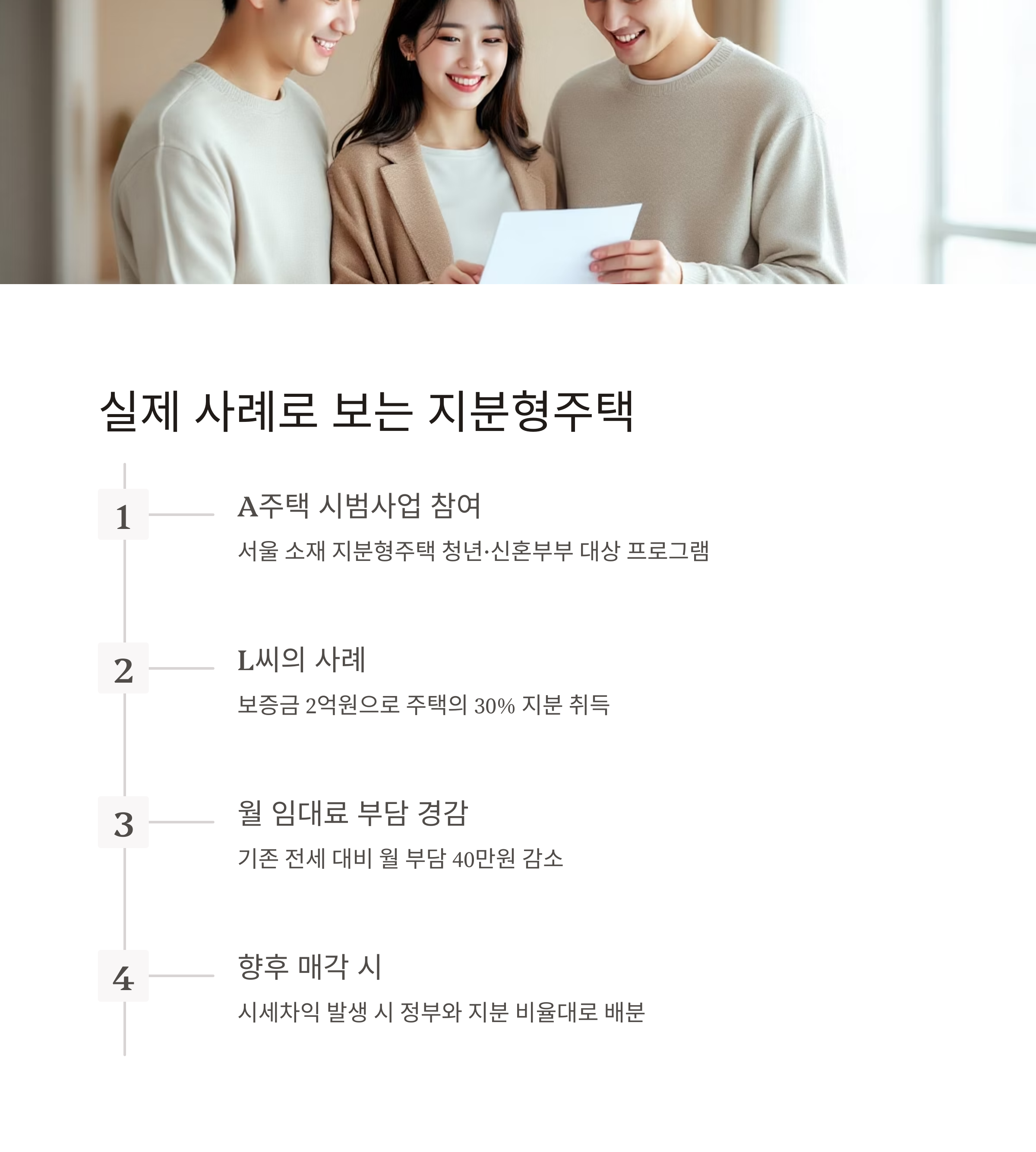 서울시의 청년 지분형 주택 ‘청년누리’ 프로젝트에서는 월 소득 400만 원 이하의 청년이 30% 지분으로 입주, 이후 5년간 안정적으로 거주하며 지분을 확장하는 방식으로 운영됩니다.