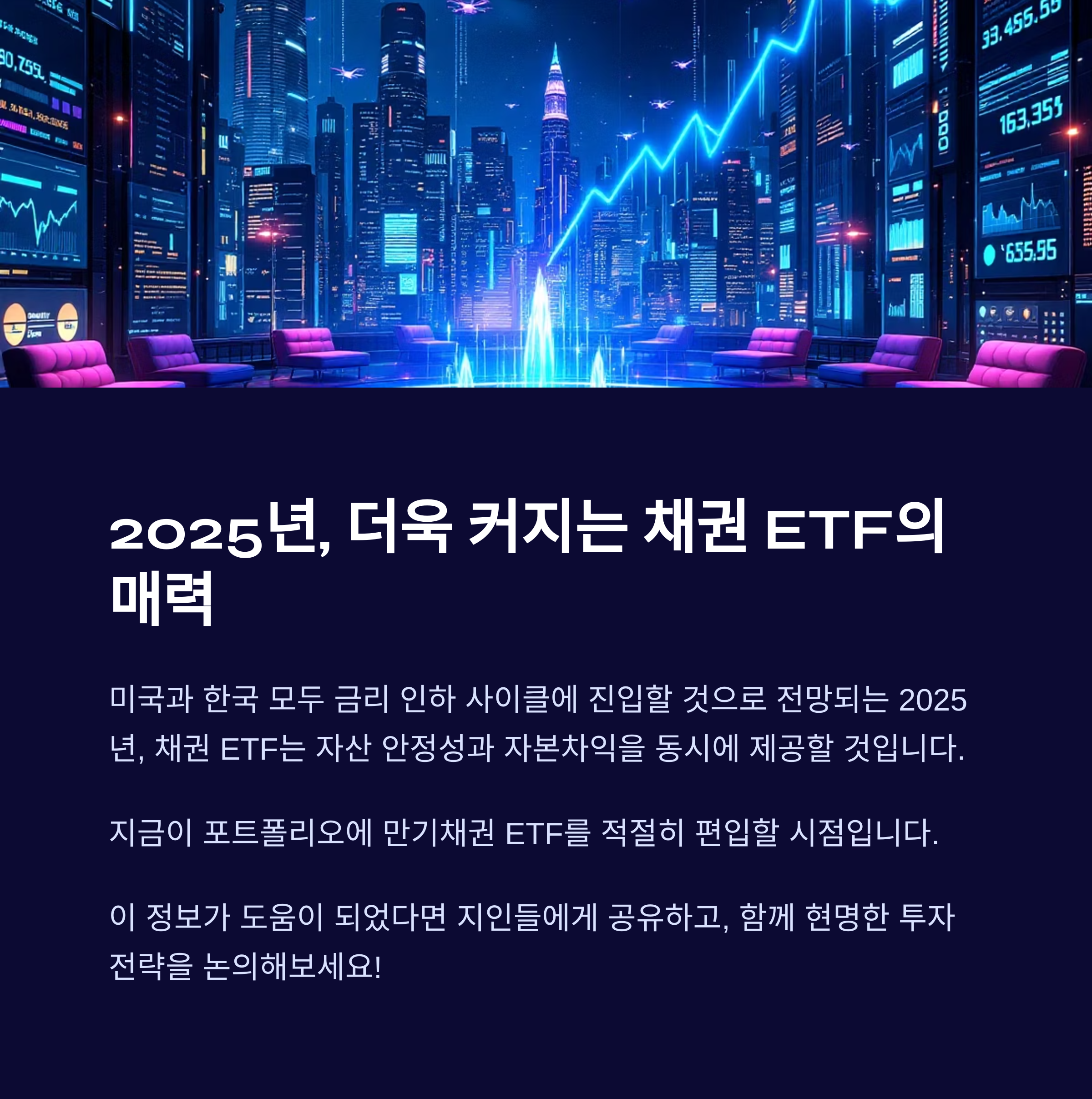 자산 안정성과 자본차익을 동시에 노릴 수 있는 지금, 포트폴리오에 만기채권 ETF를 적절히 편입하는 전략이 필요한 시점입니다.