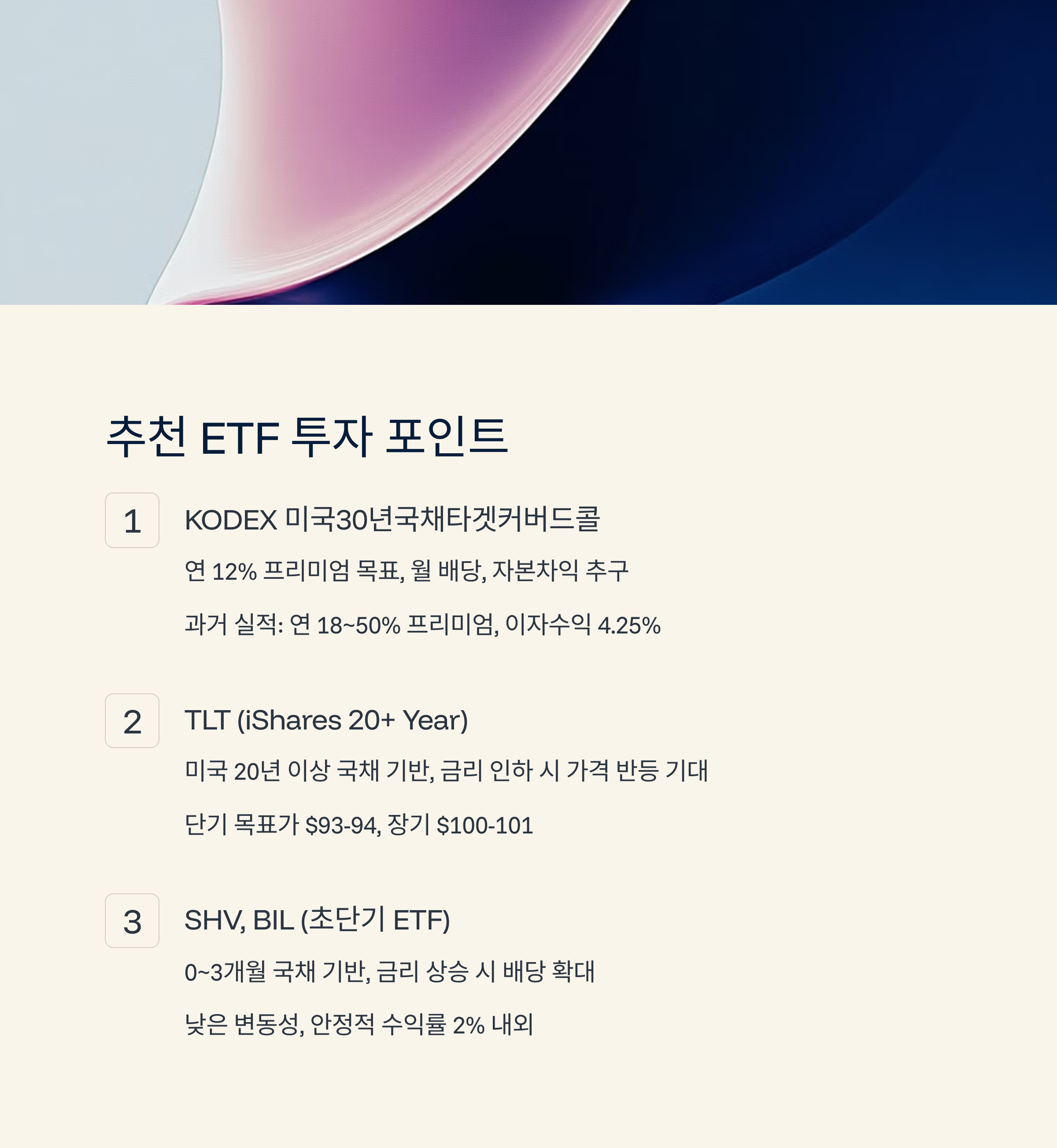 특히 만기 없는 장기채 ETF는 금리 인하가 지연되면 손실 가능성도 있습니다.