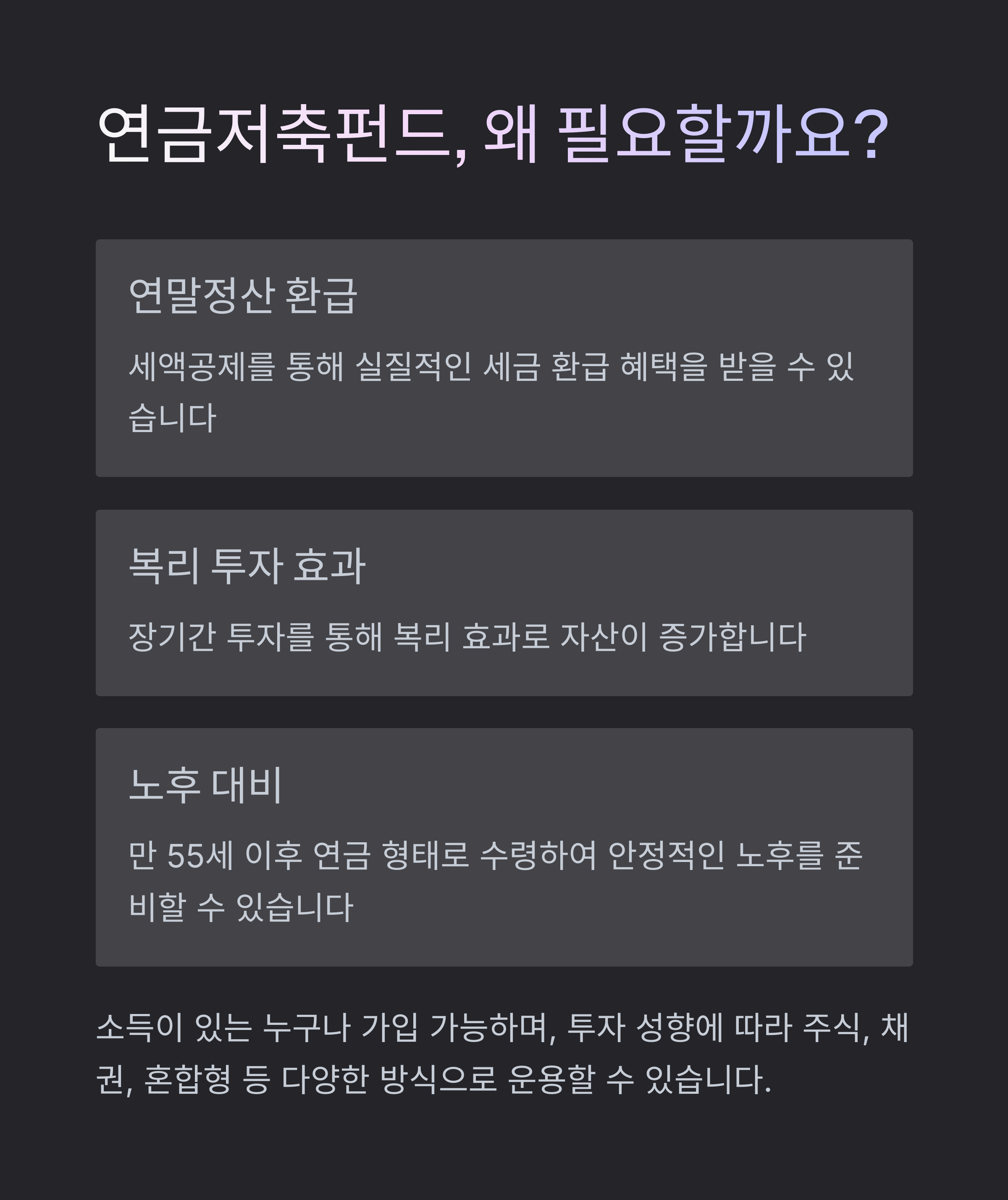 연금계좌 내 수익은 과세 이연 혜택을 받을 수 있어 장기 투자에 매우 유리합니다.