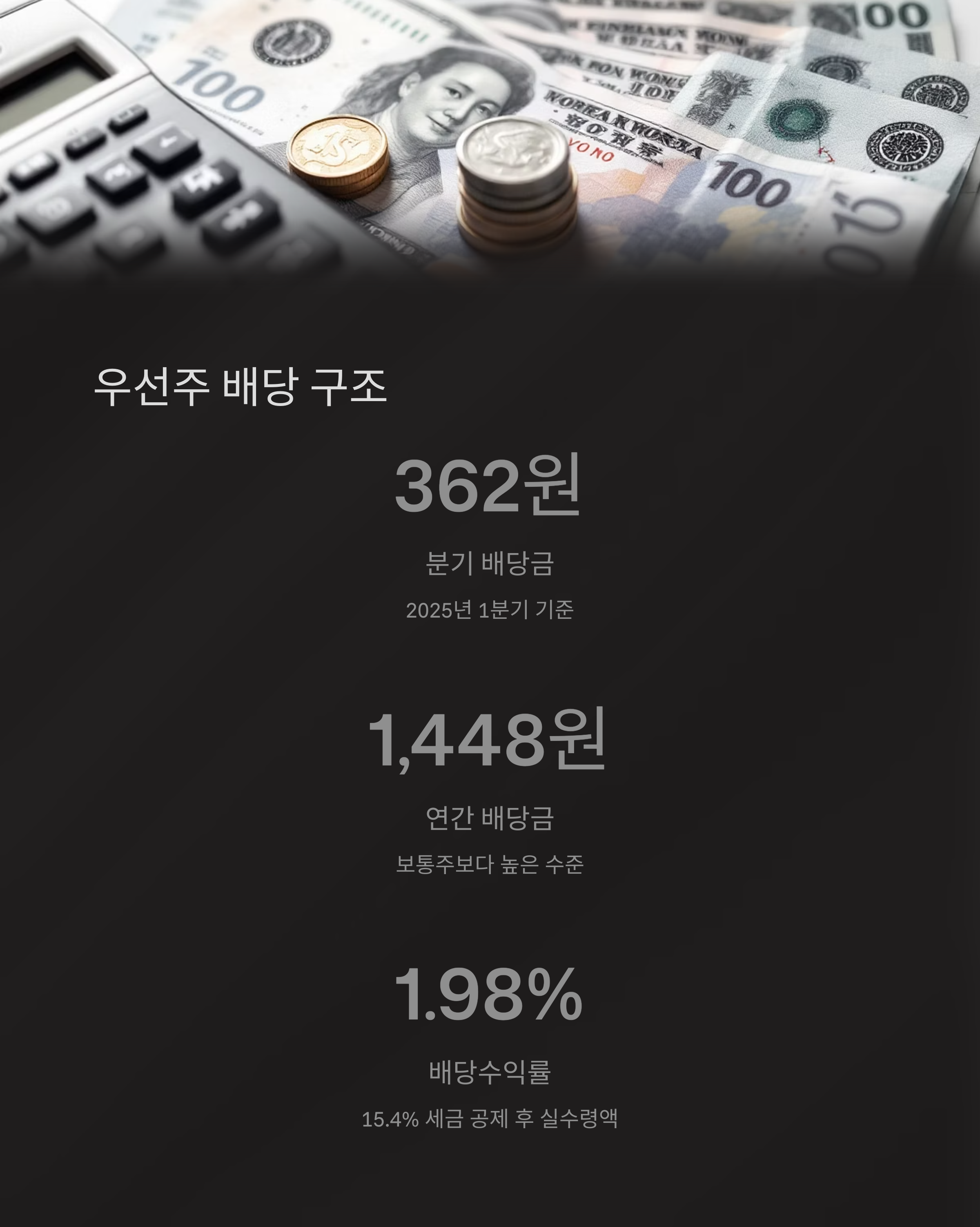 특히 2025년 기준 배당수익률은 보통주보다 소폭 높아, 배당 중심 투자자들에게 매력적인 선택지입니다.