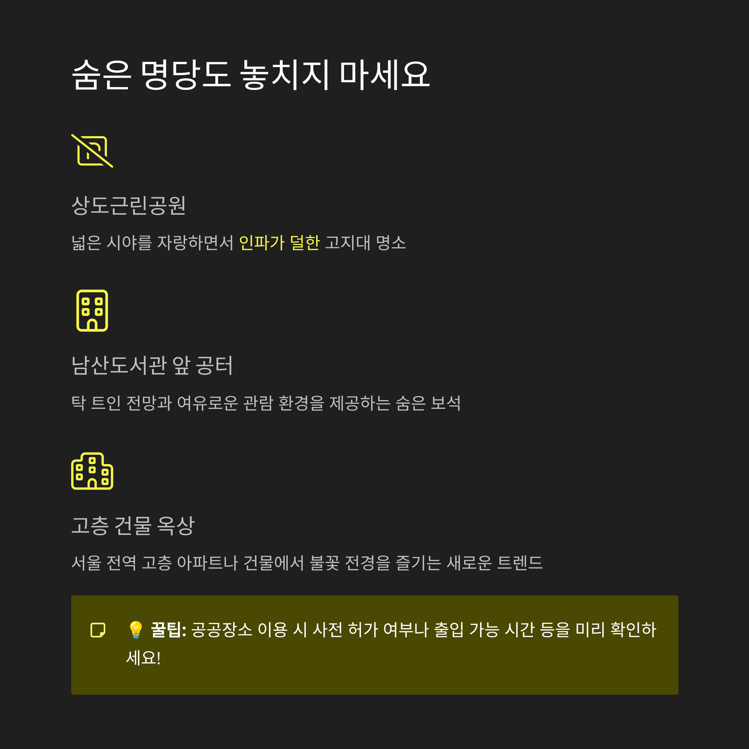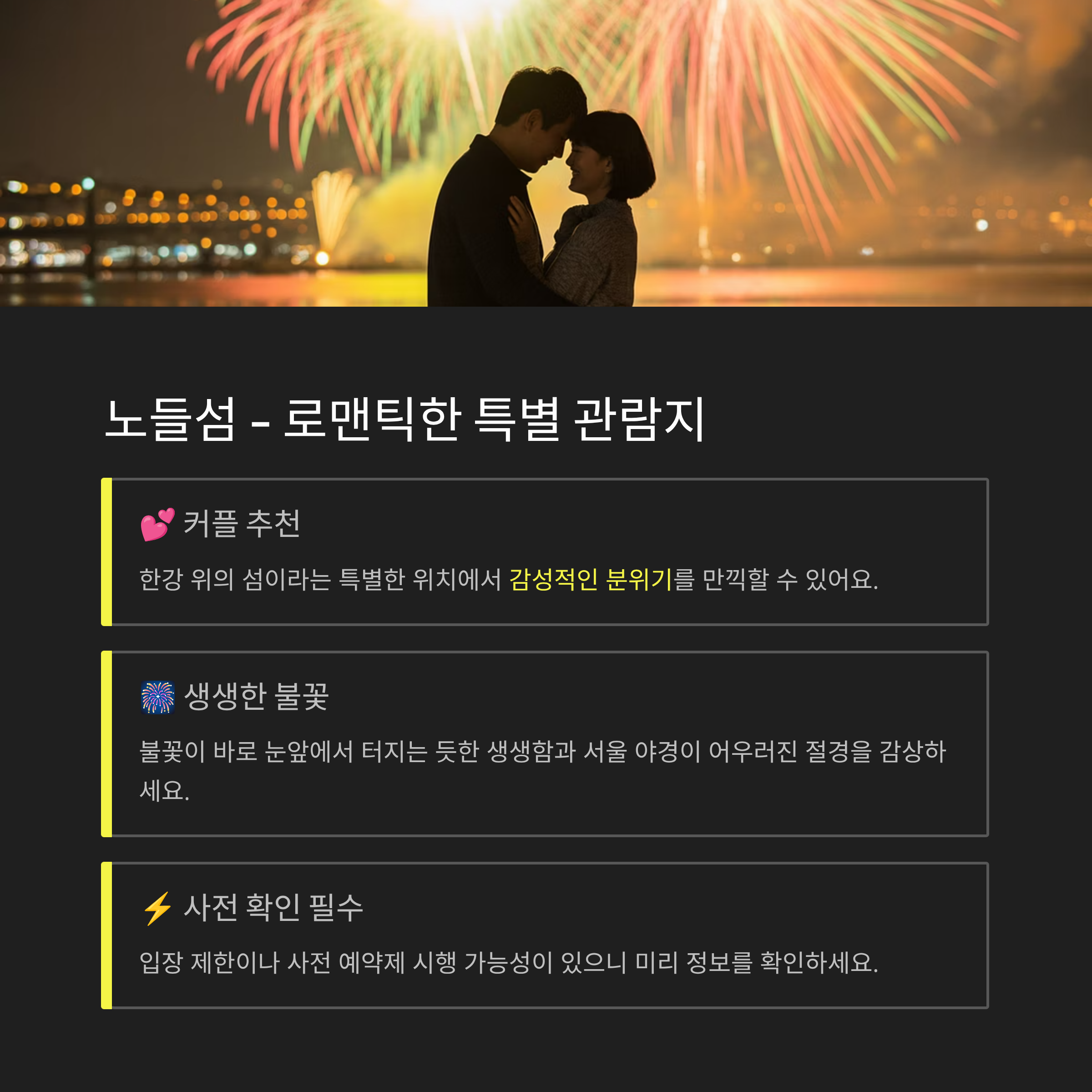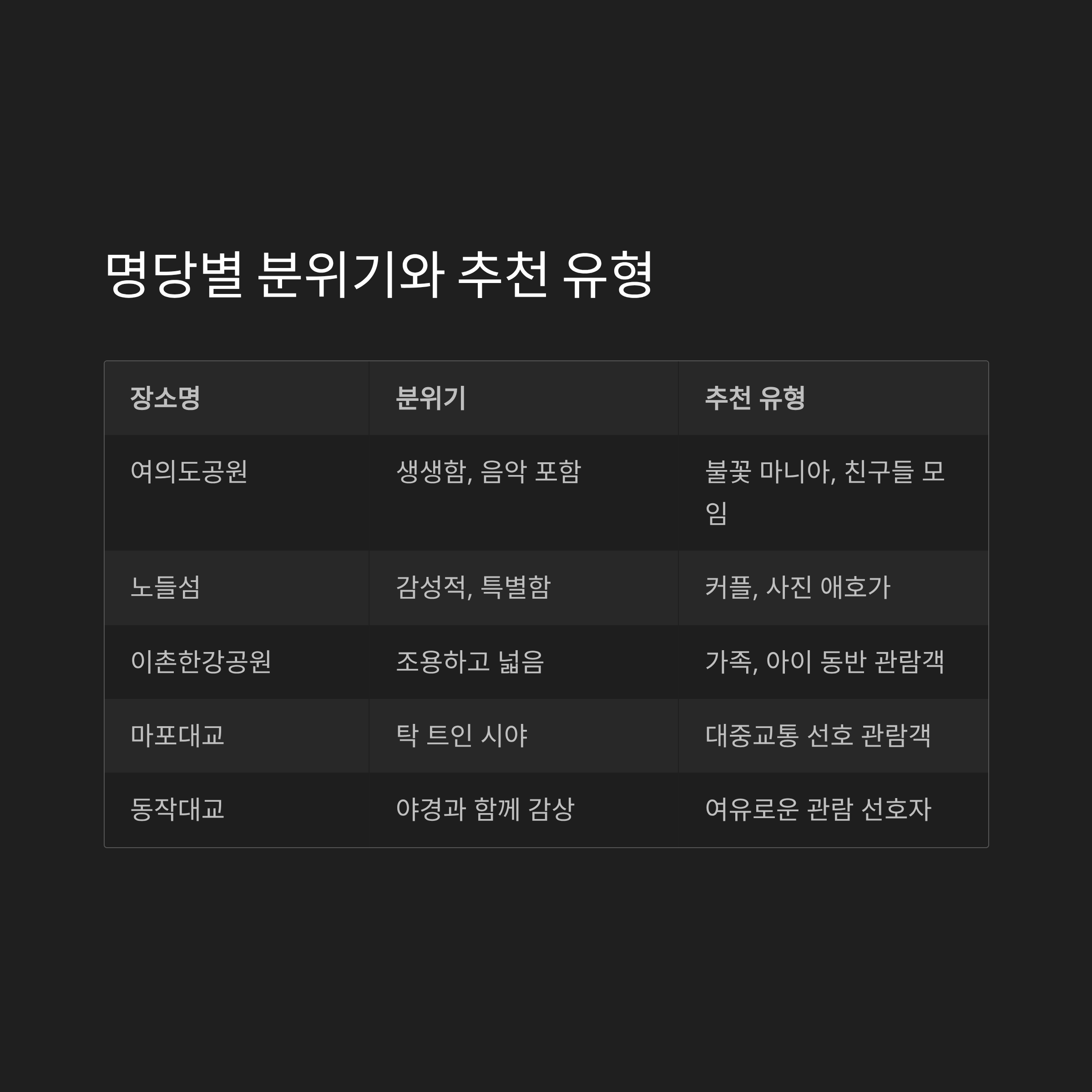 | 여의도공원 | 생생함, 음악 포함 | 불꽃 마니아, 친구들 모임 |