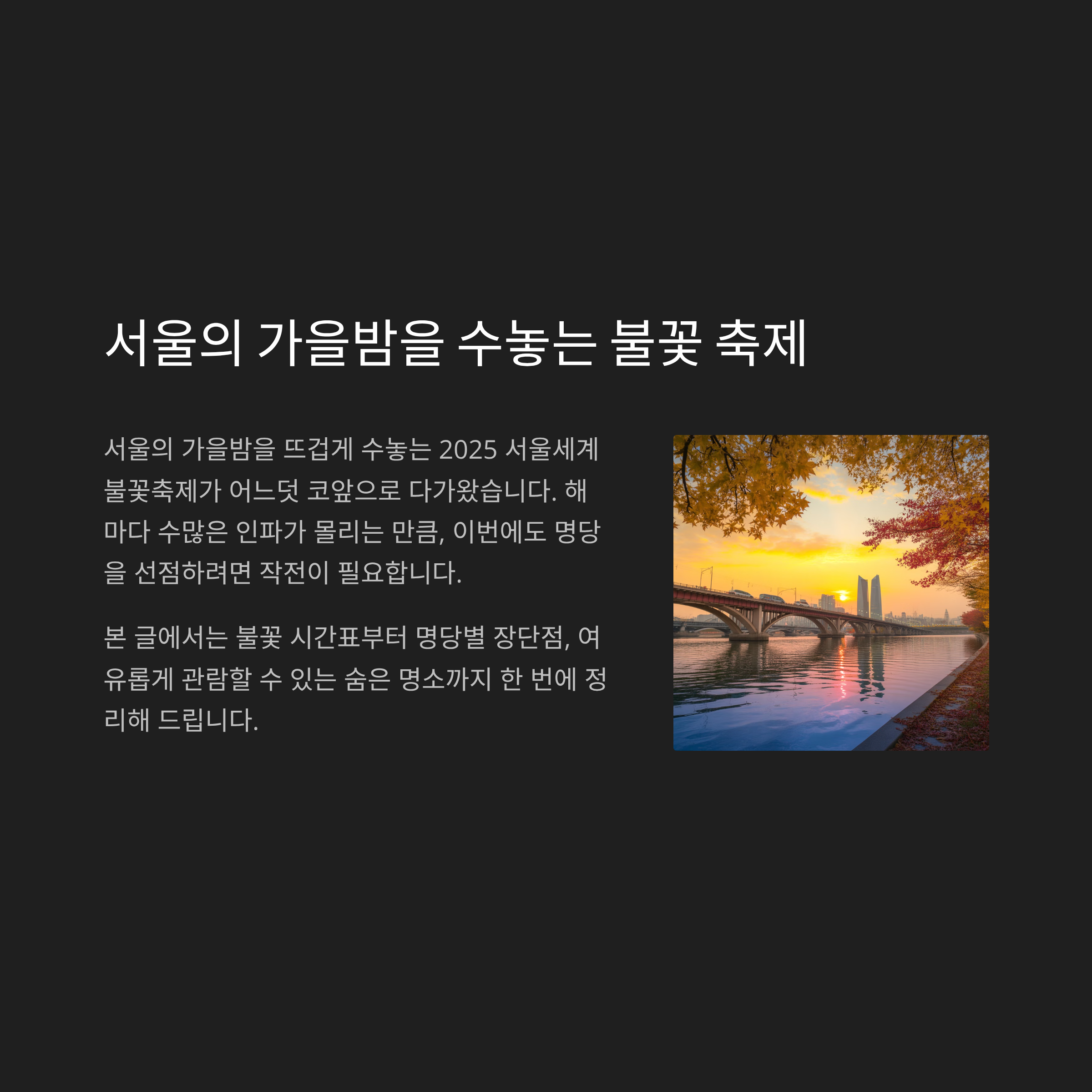 서울의 가을밤을 뜨겁게 수놓는 2025 서울세계불꽃축제가 어느덧 코앞으로 다가왔습니다.
