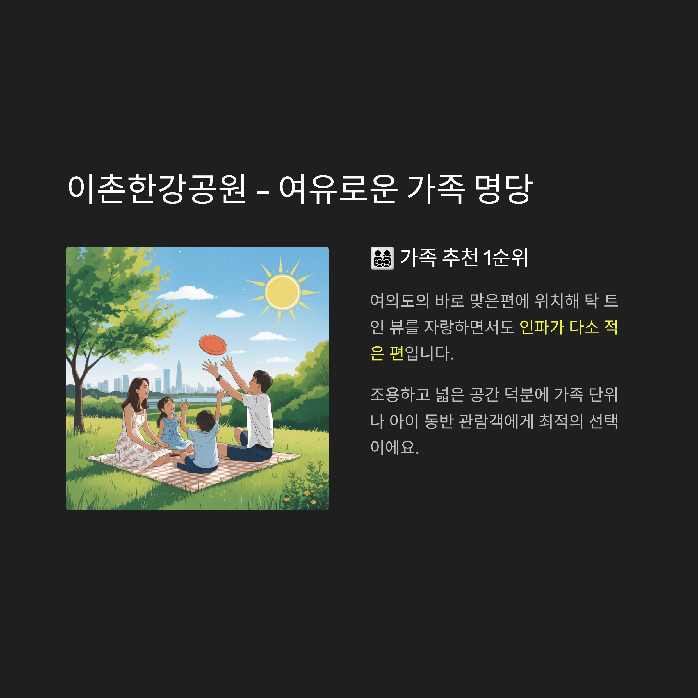| 이촌한강공원 | 조용하고 넓음 | 가족, 아이 동반 관람객 |