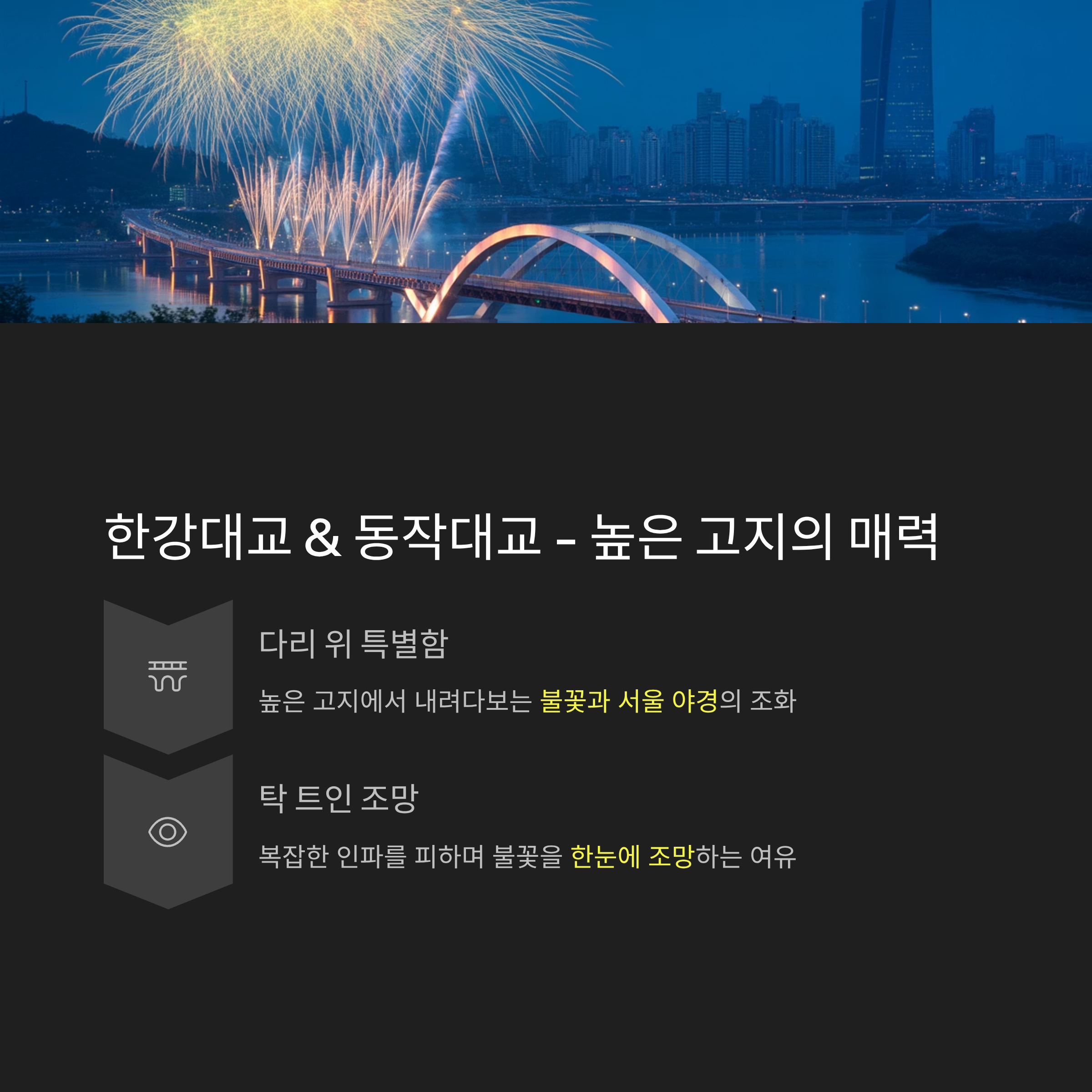 특히 동작대교와 한강대교는 높은 고지 덕분에 불꽃뿐 아니라 서울 야경까지 함께 감상할 수 있는 이점이 있어요.
