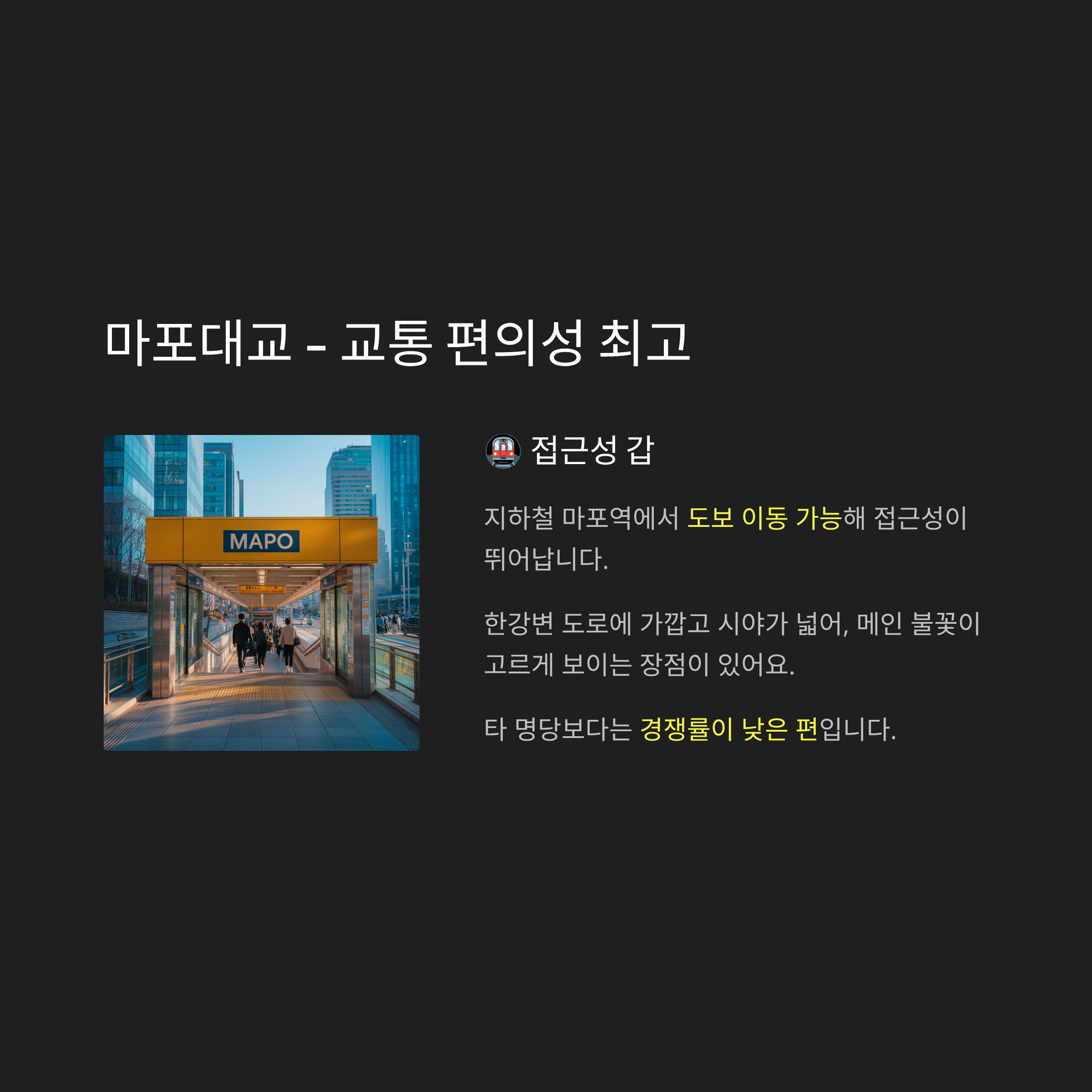 지하철 마포역에서 도보 이동이 가능해 접근성이 좋습니다.