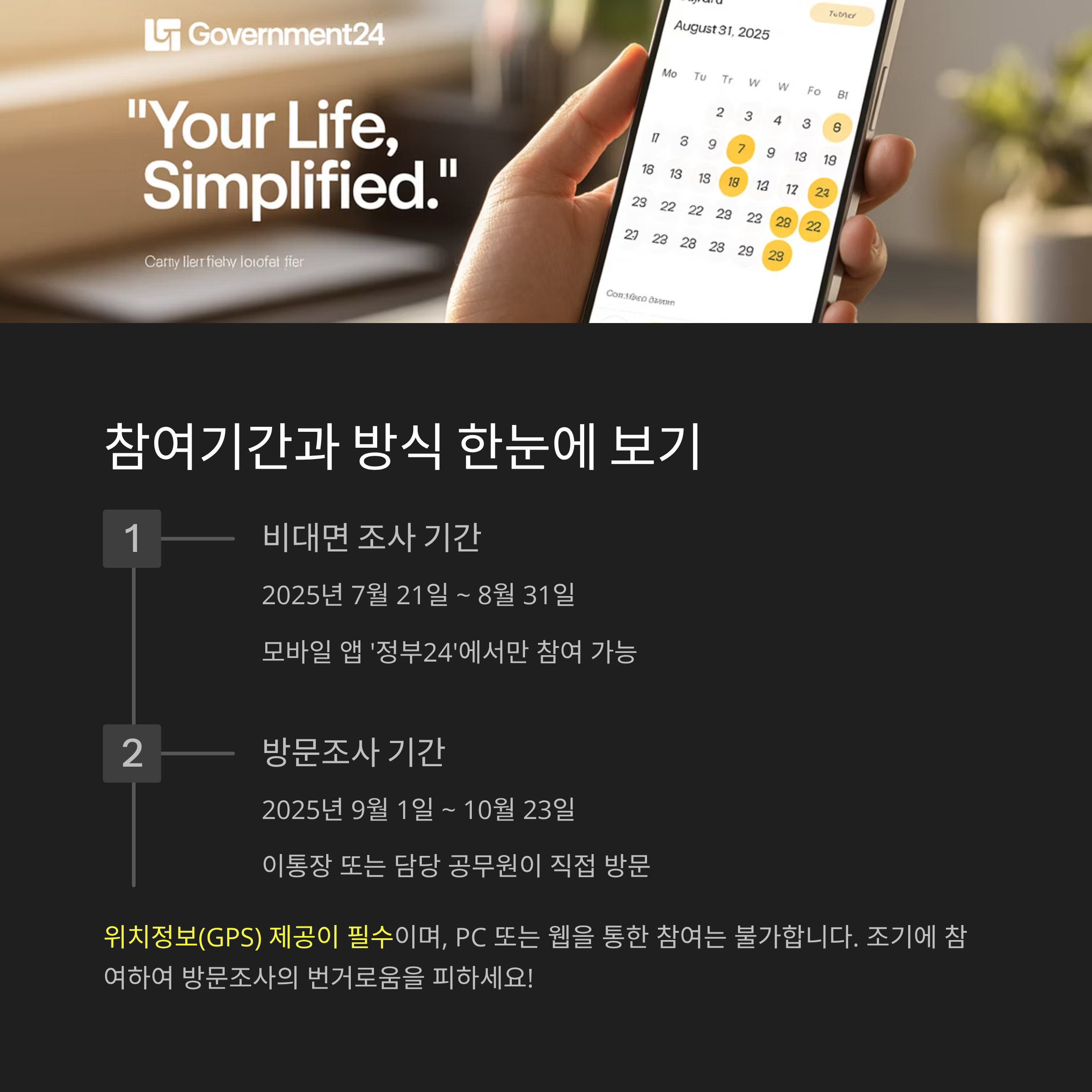 비대면 조사는 2025년 7월 21일부터 8월 31일까지 진행되며, 모바일 앱 ‘정부24’에서만 참여가 가능합니다.