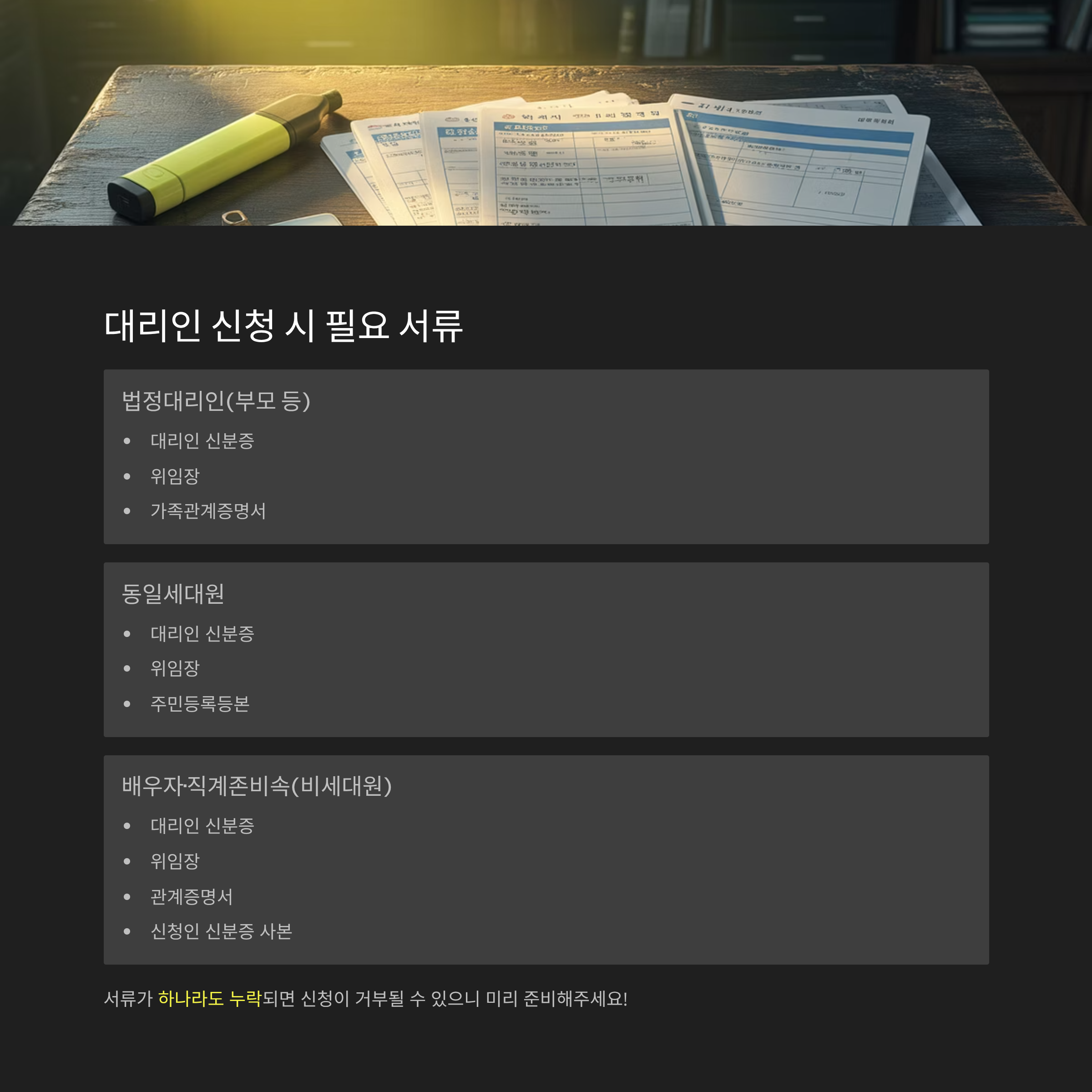 배우자·직계존비속(비세대원) 대리인 신분증, 위임장, 관계증명서, 신청인 신분증 사본