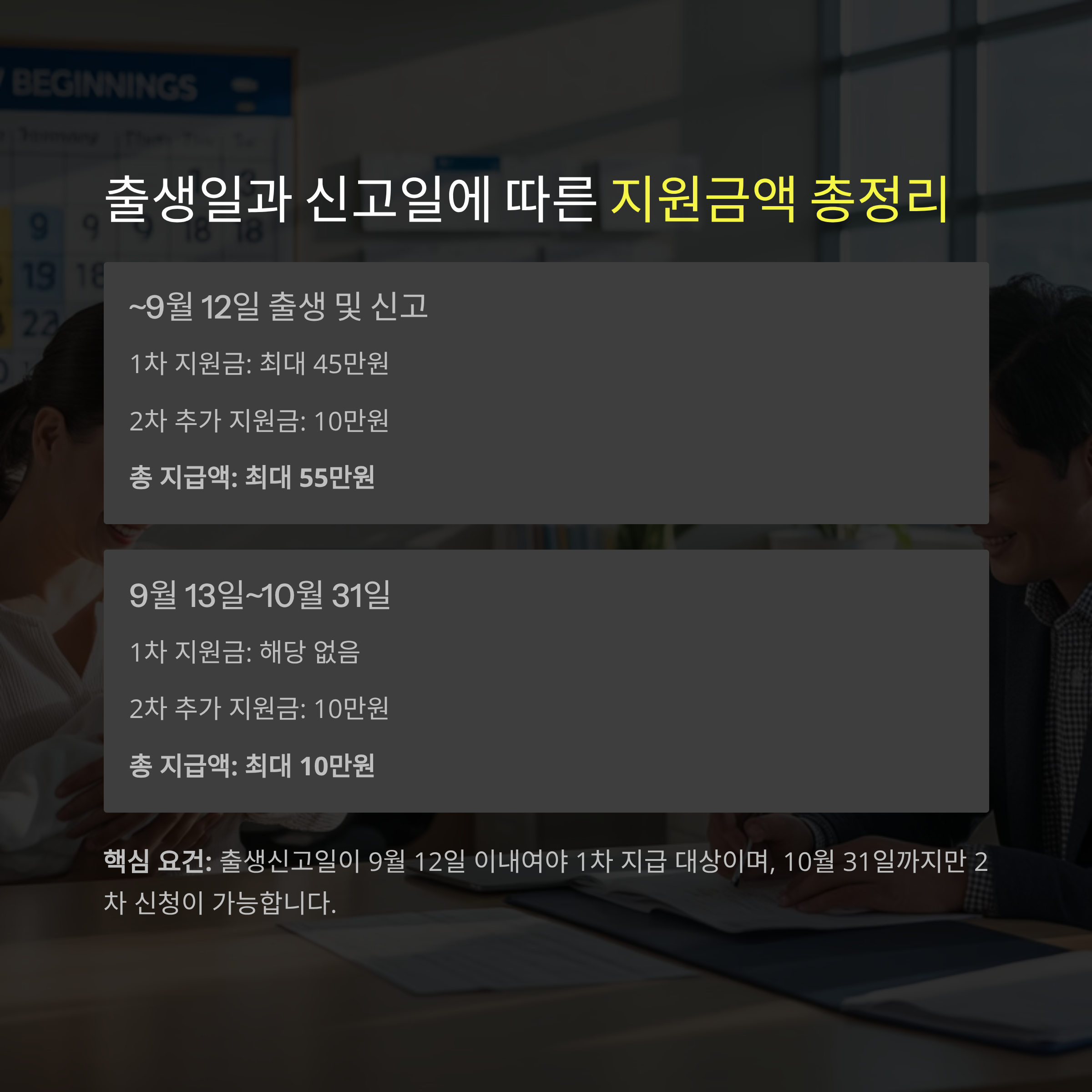 1차 기본 15만원과 추가 지급 포함 최대 55만원까지 가능하며 9월 20일 출생이라면 2차 10만원만 지급됩니다.