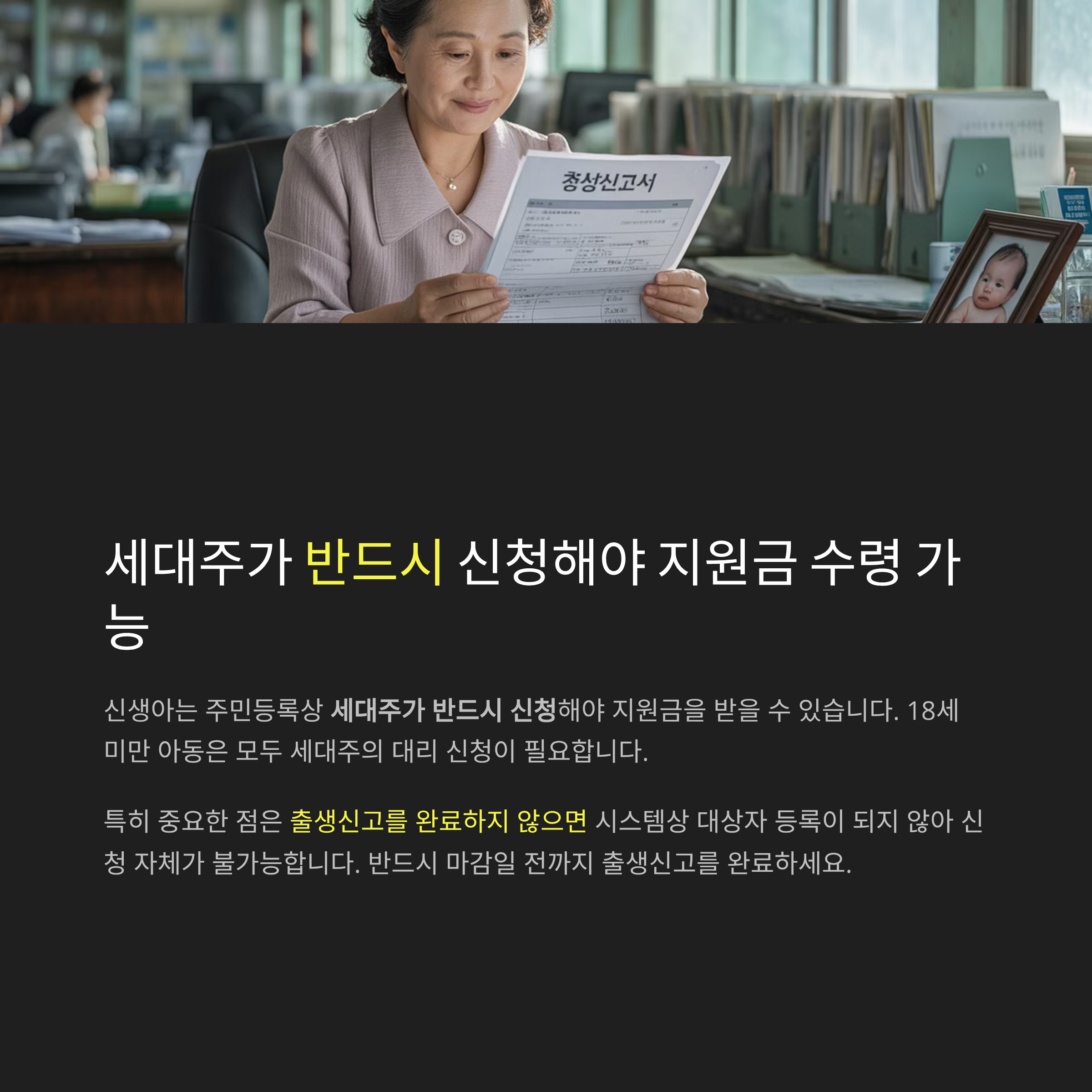 18세 미만 아동의 경우 모두 세대주 대리 신청이 필요하며, 출생신고를 마치지 않으면 시스템상 대상자 등록이 되지 않아