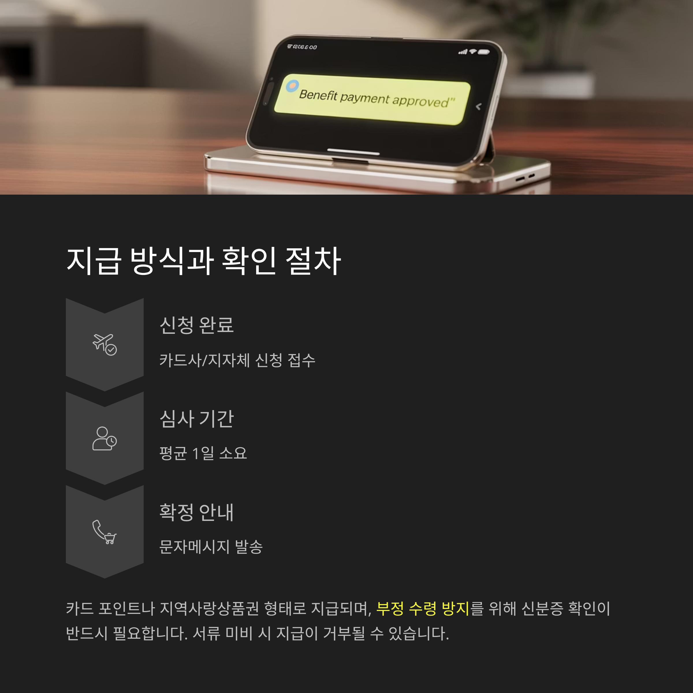 신청 후 평균 1일 내 카드 포인트나 지역사랑상품권 형태로 지급되며, 확정 시 안내 문자가 발송됩니다.