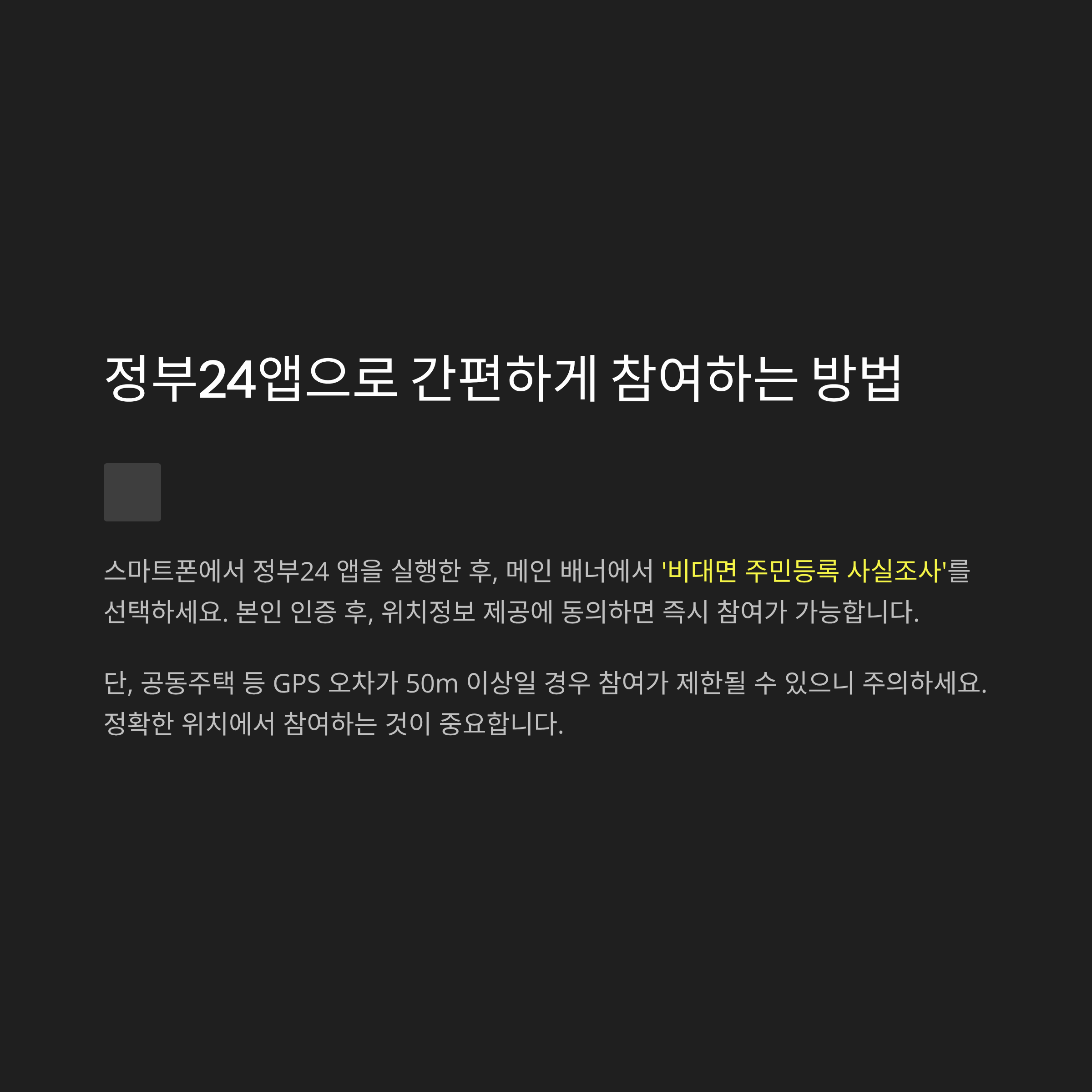 참여방법 정부24앱 접속 → 주민등록 사실조사 클릭