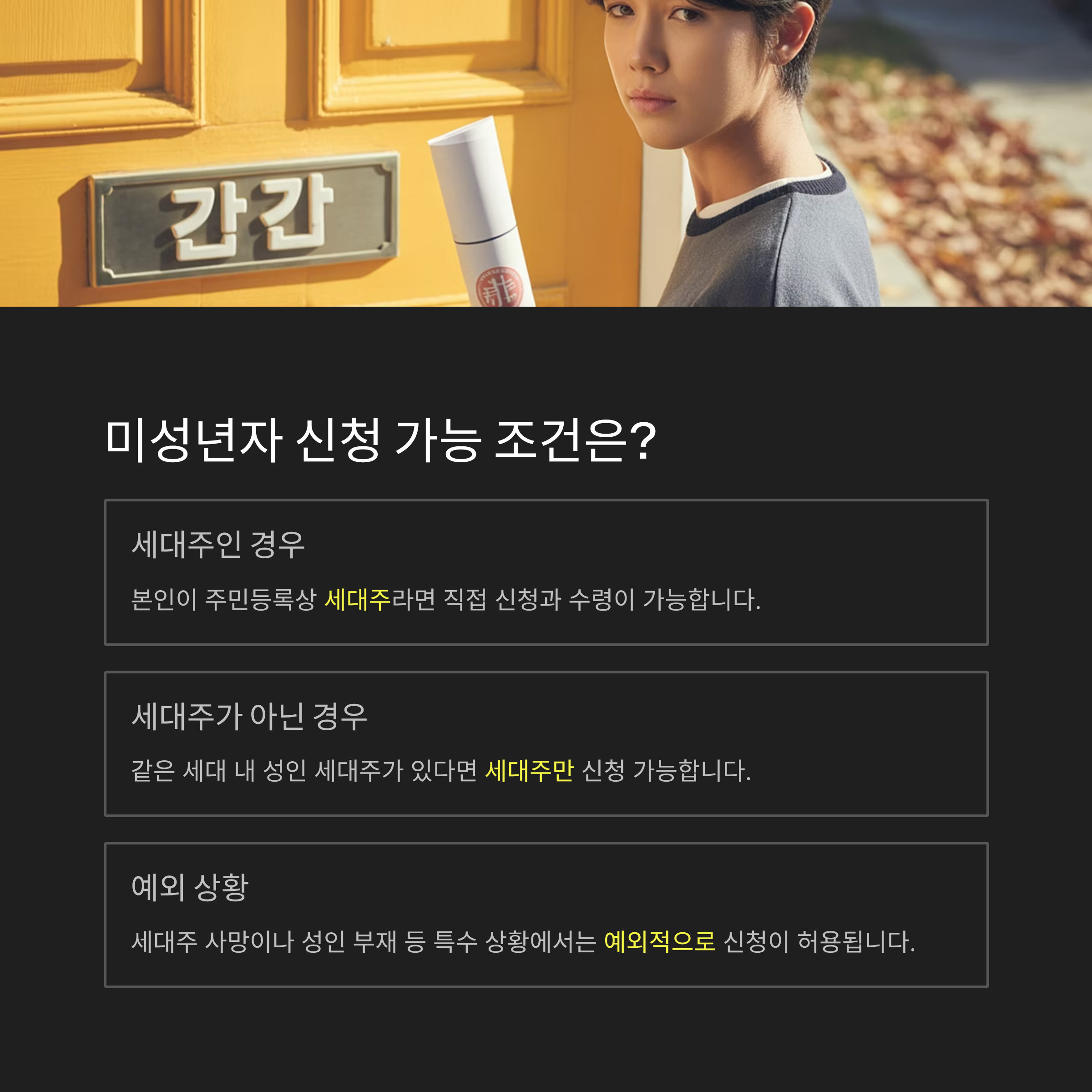 세대주 사망이나 성인 부재 등 특수 상황에서는 예외적으로 신청이 허용됩니다.
