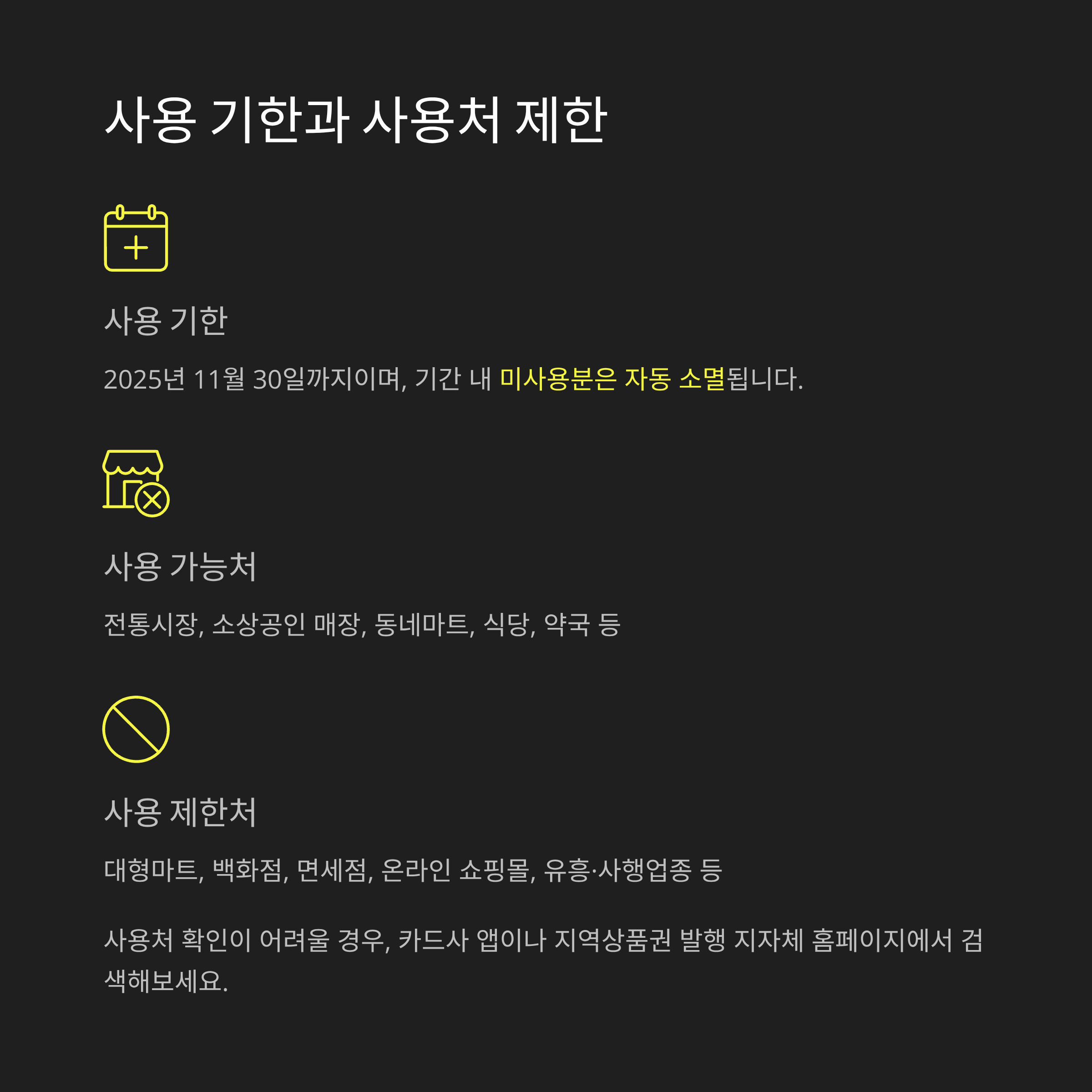 사용처는 전통시장, 소상공인 매장, 동네마트, 식당, 약국 등이며 대형마트, 백화점, 면세점, 온라인 쇼핑몰, 유흥·사행업종 등은 제외됩니다.