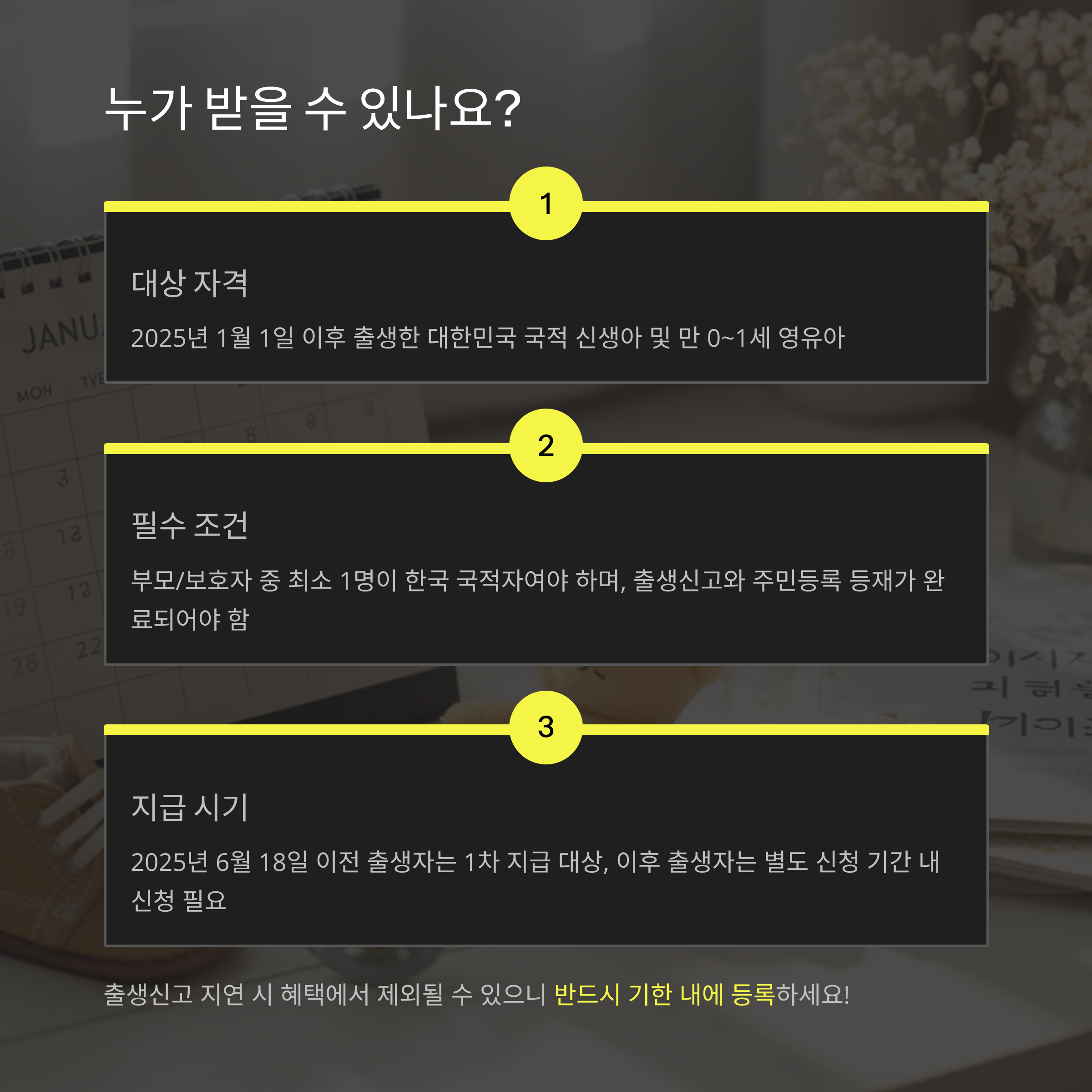 특히 이번 정책에서는 출생신고 시점과 신청 마감일이 핵심 기준으로 작용하고 있어, 신생아 부모님의 주의가 요구됩니다.