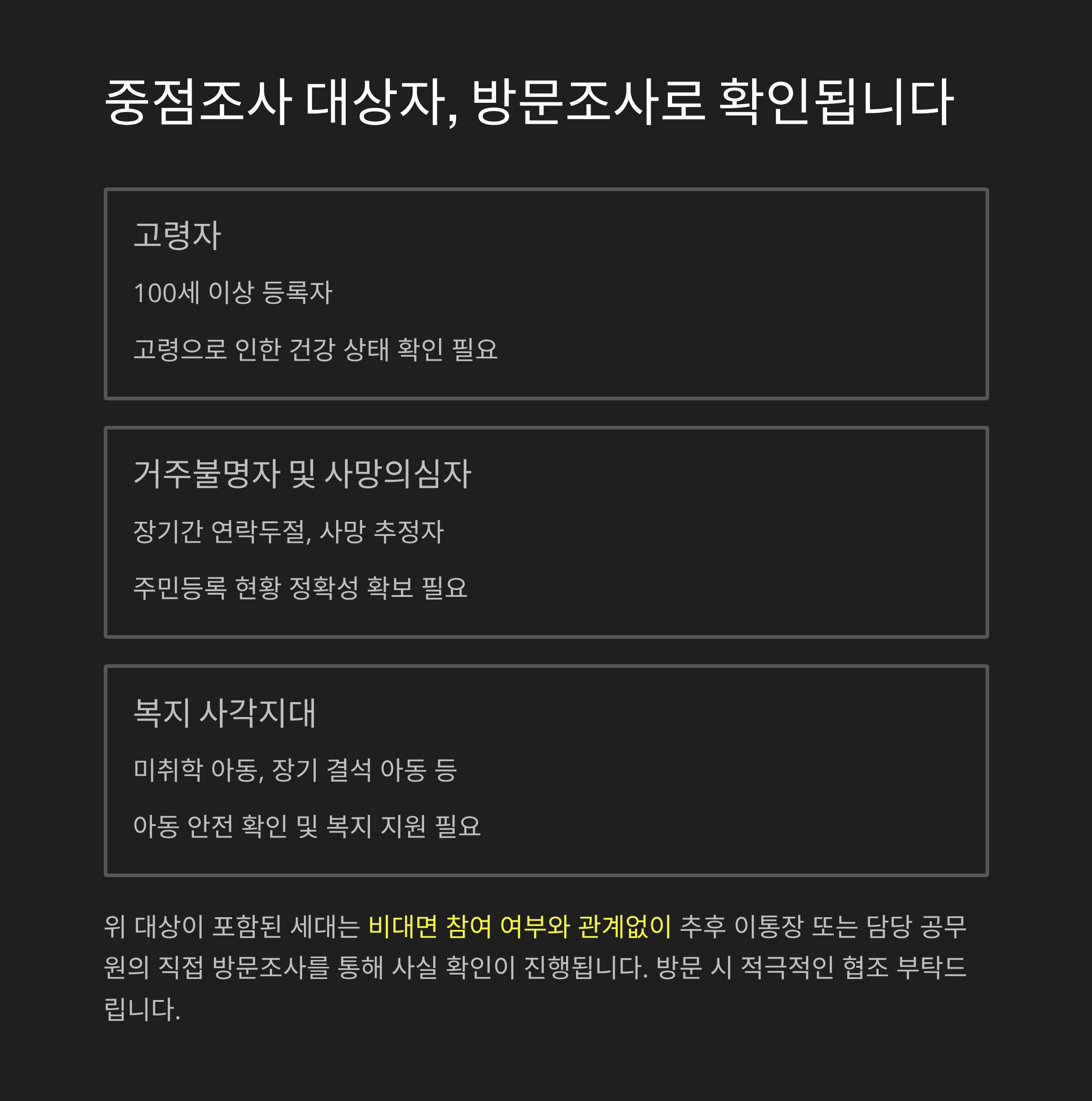 다음과 같은 중점조사 대상이 포함된 세대는 비대면 참여 여부와 관계없이 추후 이통장 또는 담당 공무원의