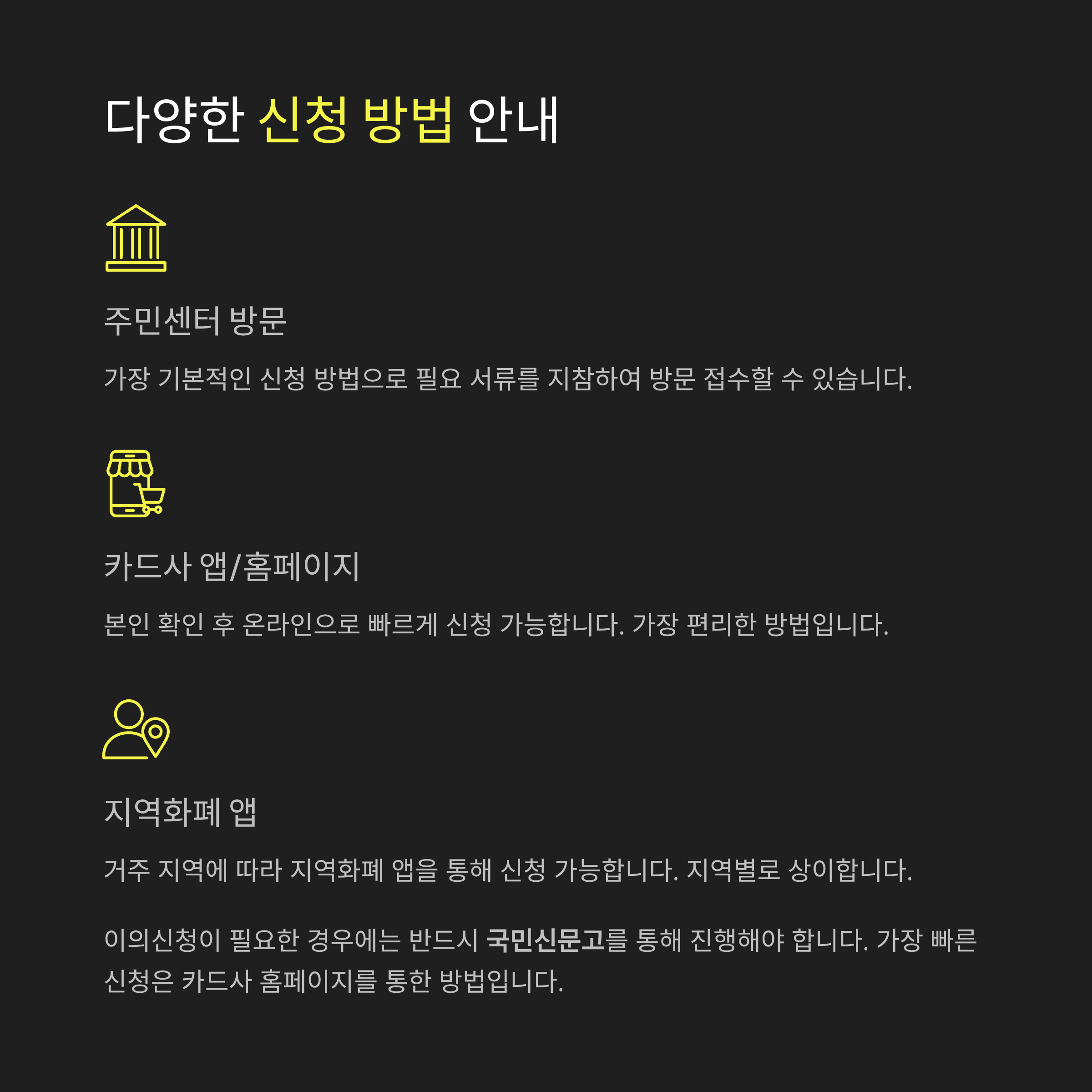 신청 채널 카드사 앱·홈페이지·은행·주민센터