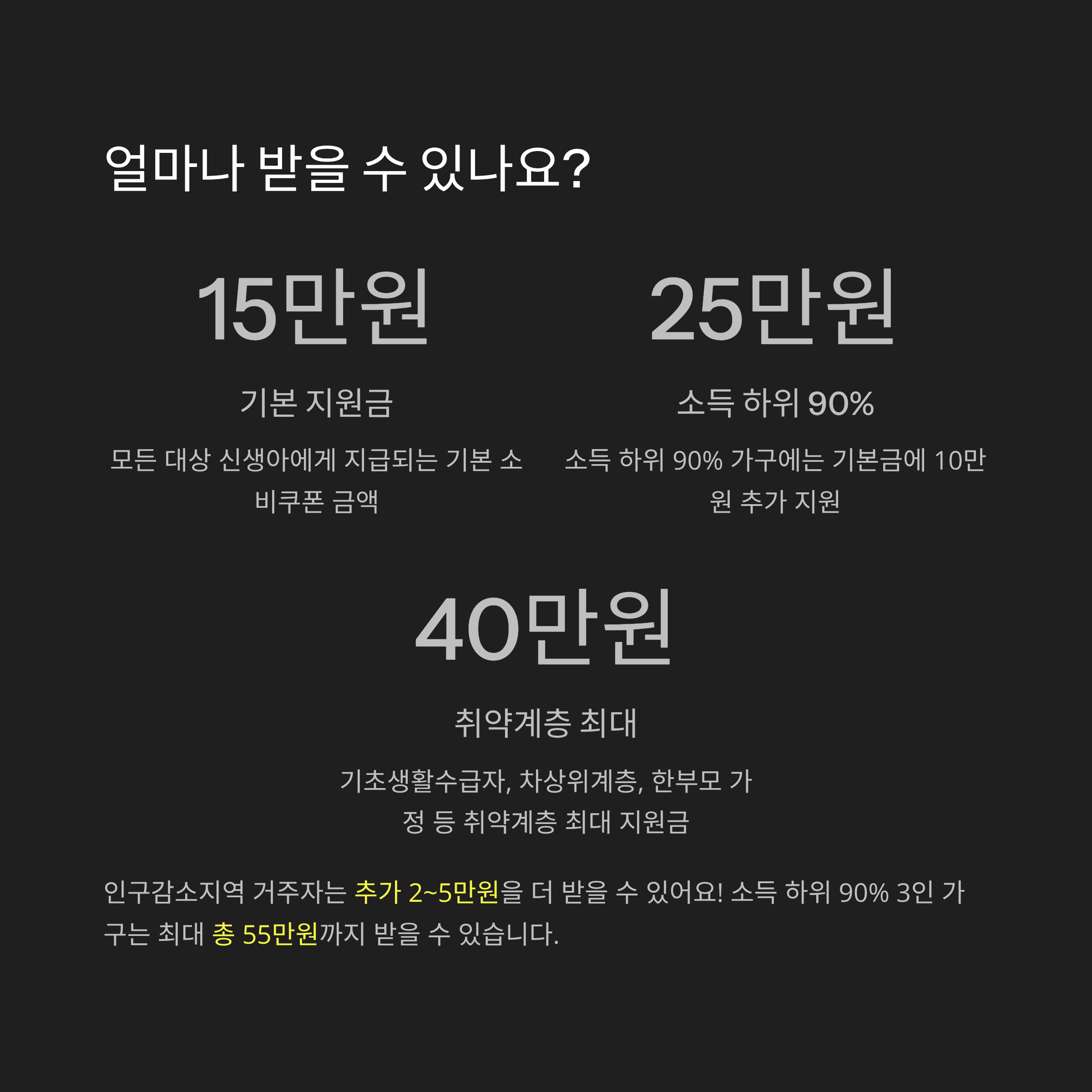 2025년 정부가 시행하는 민생회복 소비쿠폰 지급 정책에 따라, 신생아 가정도 일정 요건을 충족하면 최대 55만원까지 지원받을 수 있습니다.