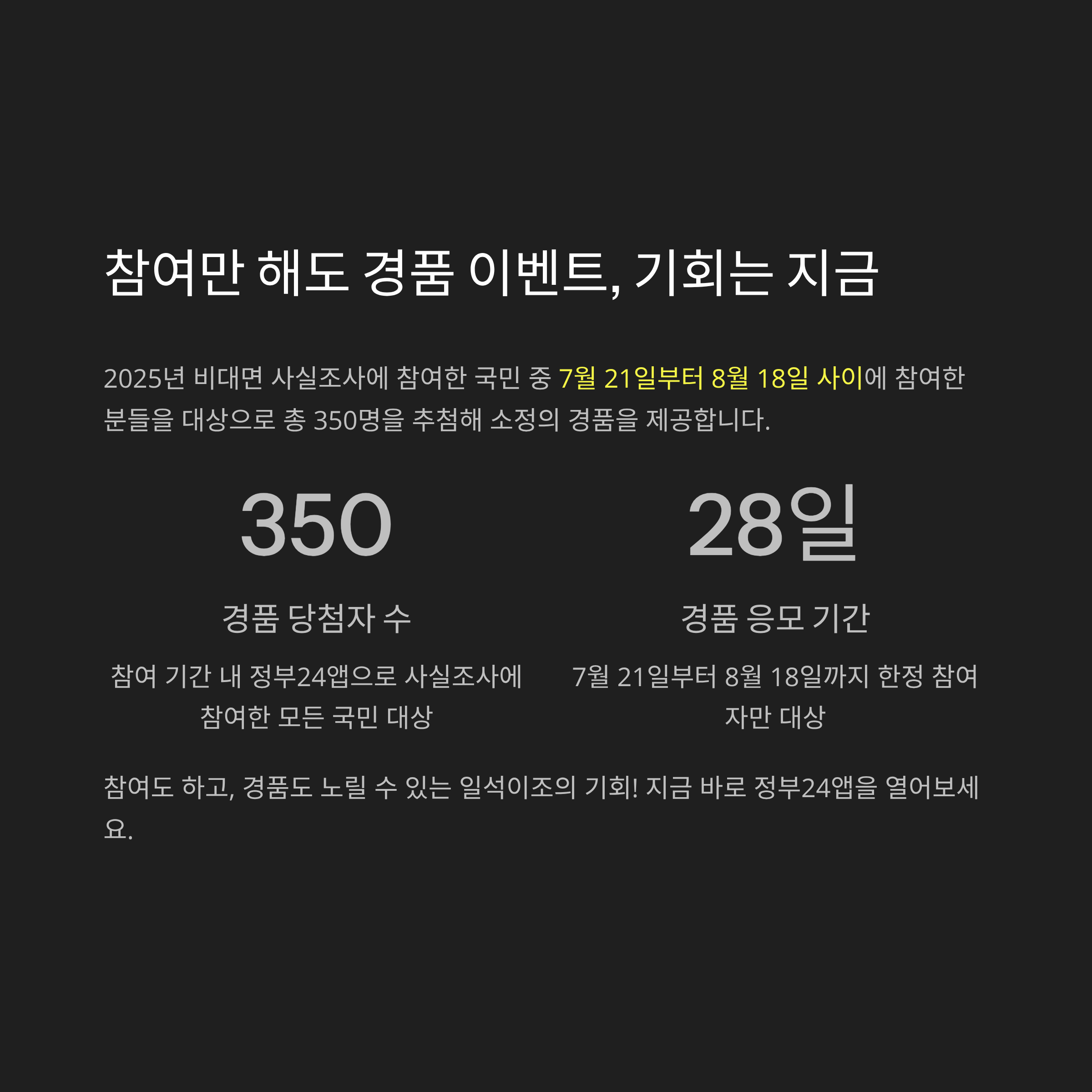 정부24 앱을 통해 누구나 간편하게 참여할 수 있으며, 참여자 중 추첨을 통한 경품 이벤트도 마련되어 있습니다.