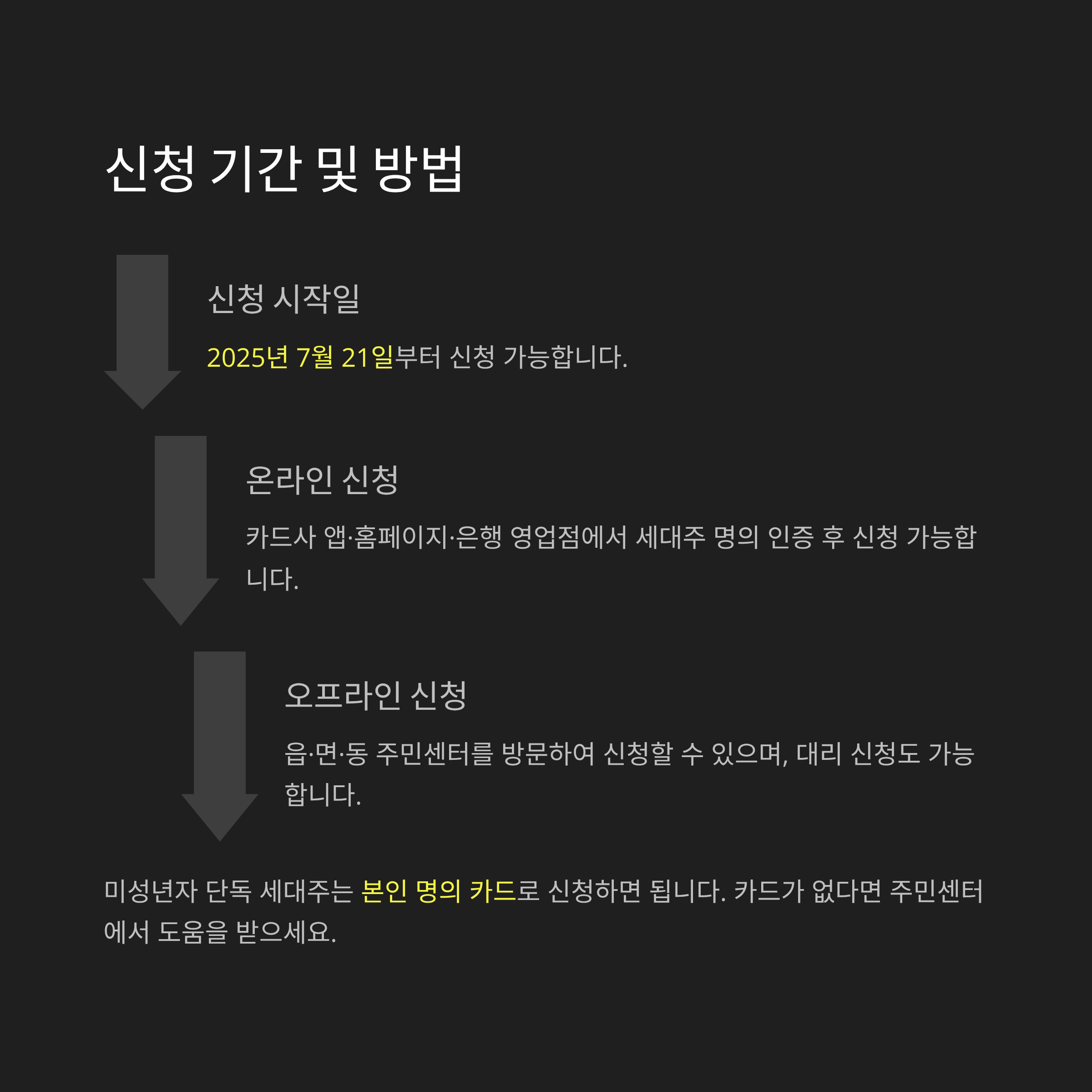신청 시작일은 2025년 7월 21일이며, 카드사 앱·홈페이지·은행 영업점에서