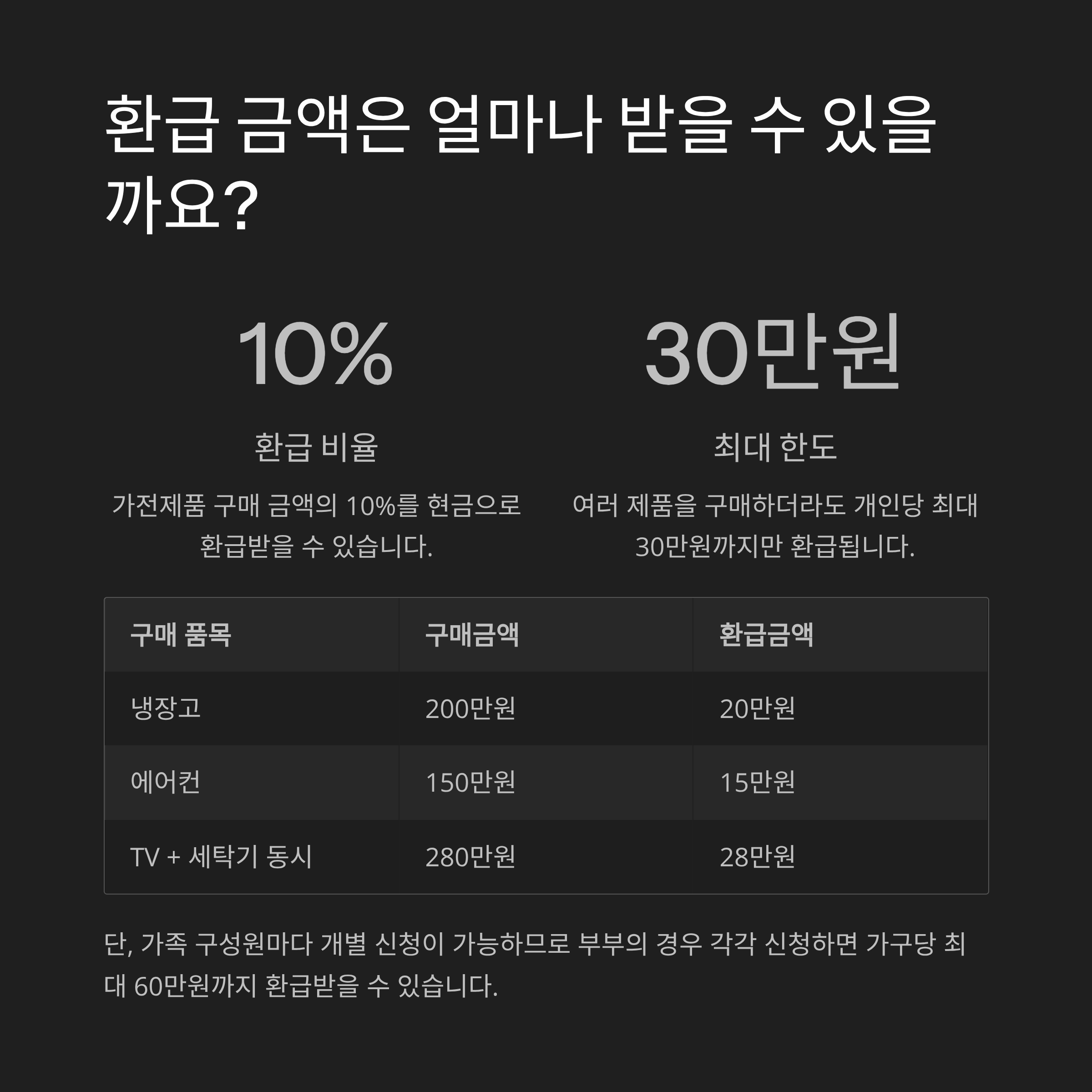 가전 제품을 구매한 금액의 10%를 돌려받을 수 있으며, 최대 한도는 개인당 30만원입니다.