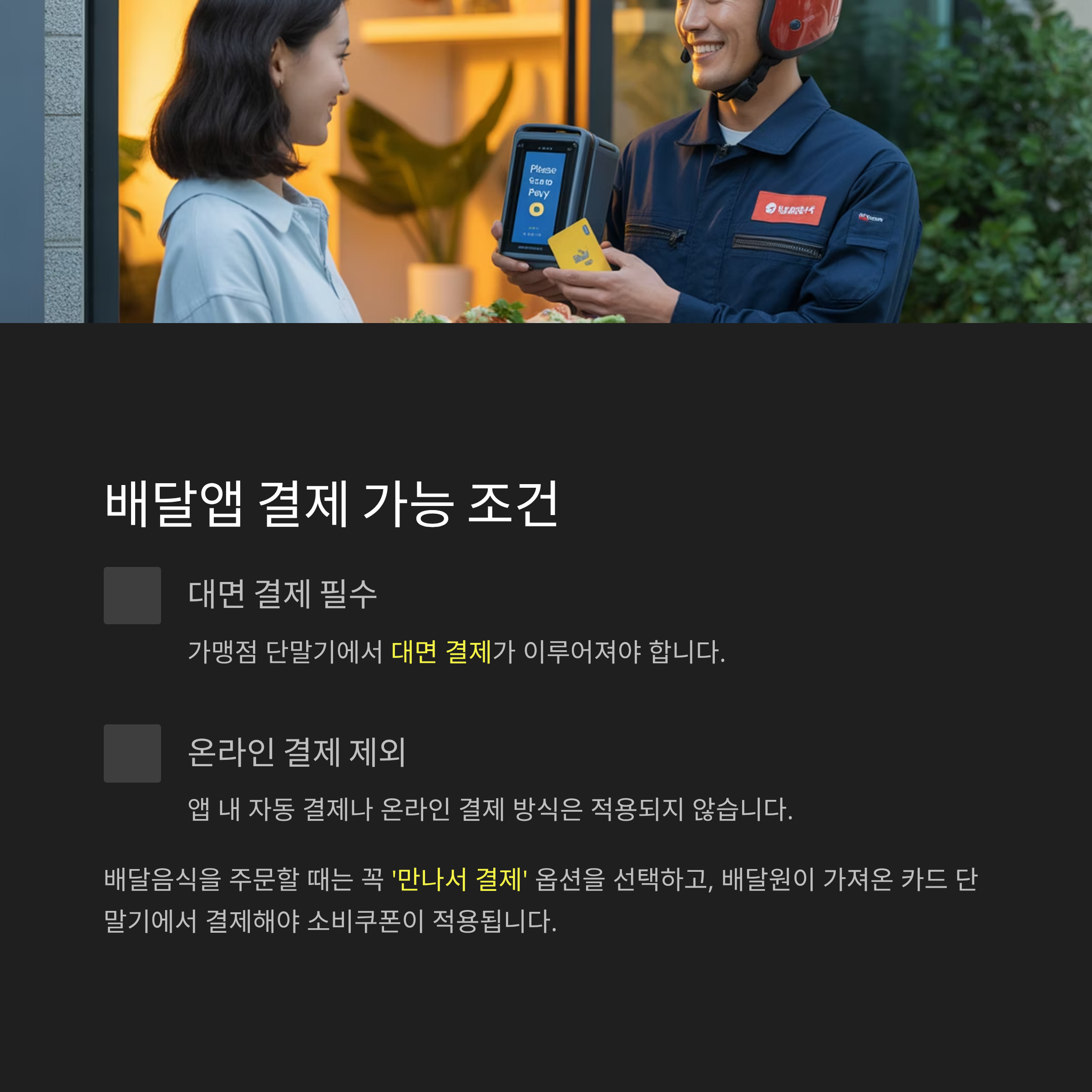 배달앱으로 결제하려면 가맹점 단말기에서 대면 결제가 이루어져야 하며,