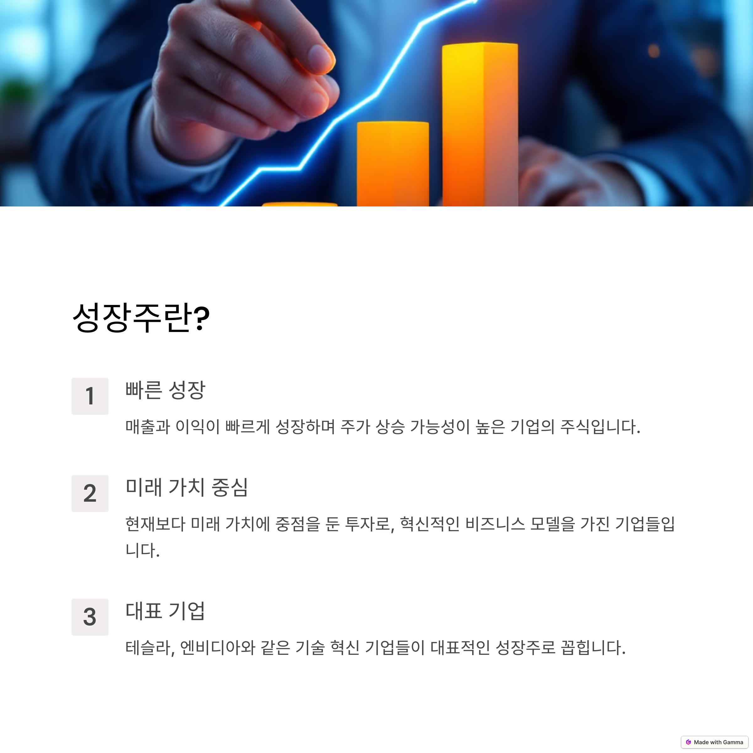 | 성장주란? | 빠른 매출 성장과 높은 주가 상승 가능성을 지닌 기업 |