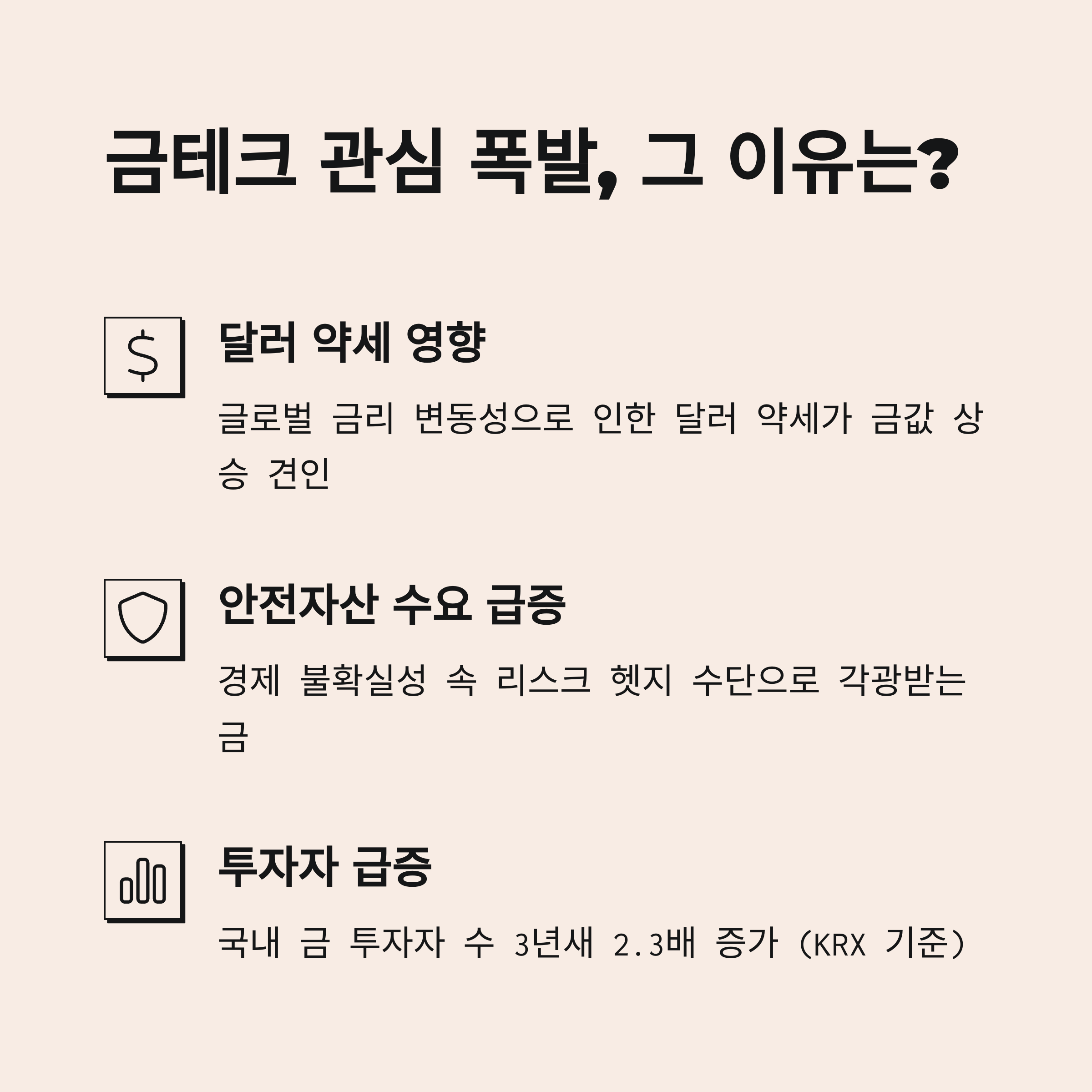 이러한 분위기 속에서 금테크를 고민하는 분들이 급증하고 있으며, 투자 전략의 다양화가 필요해졌습니다.