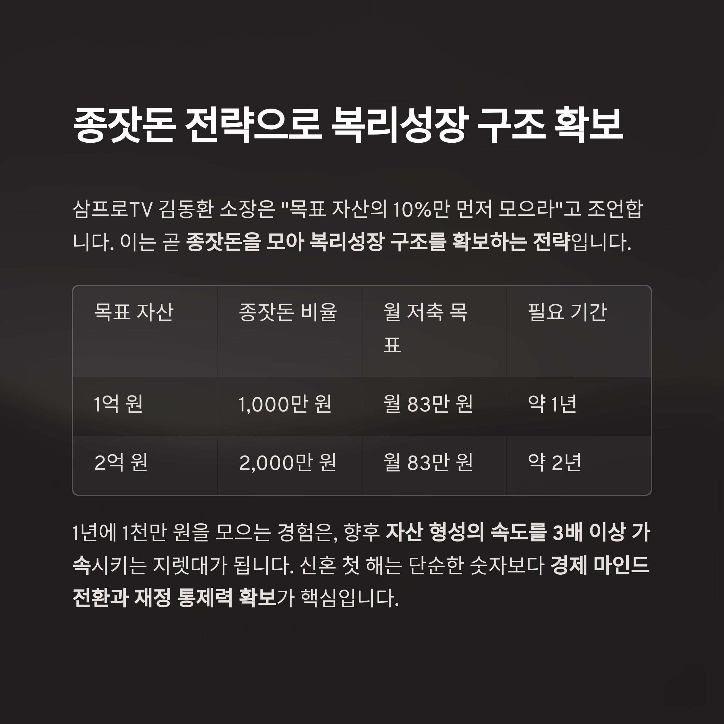 이는 곧 종잣돈을 모아 복리성장 구조를 확보하는 전략입니다.
