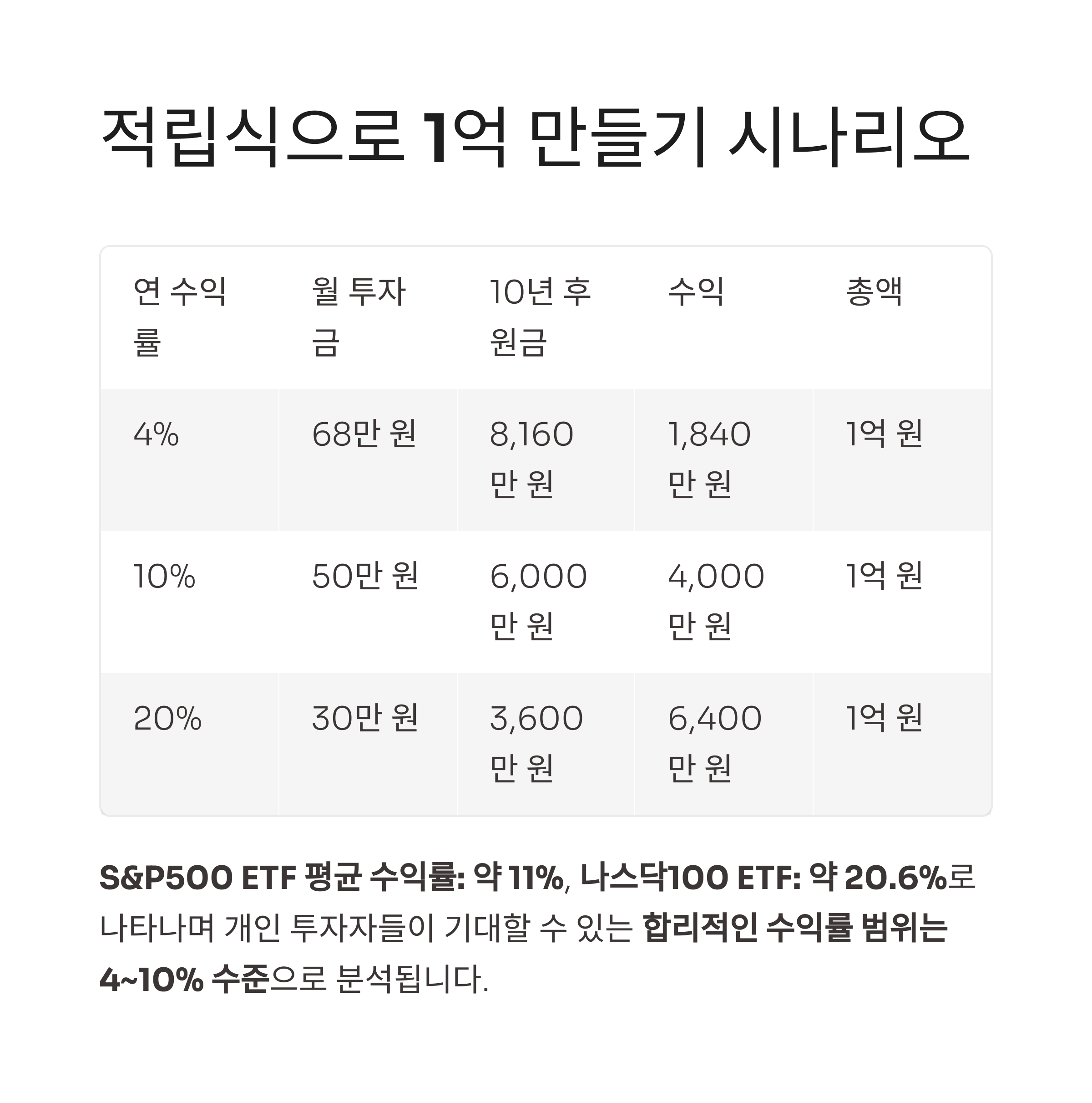 월 50만~68만 원 정도의 투자금으로 10년간 1억 원을 모으는 것도 충분히 가능한 시나리오입니다.