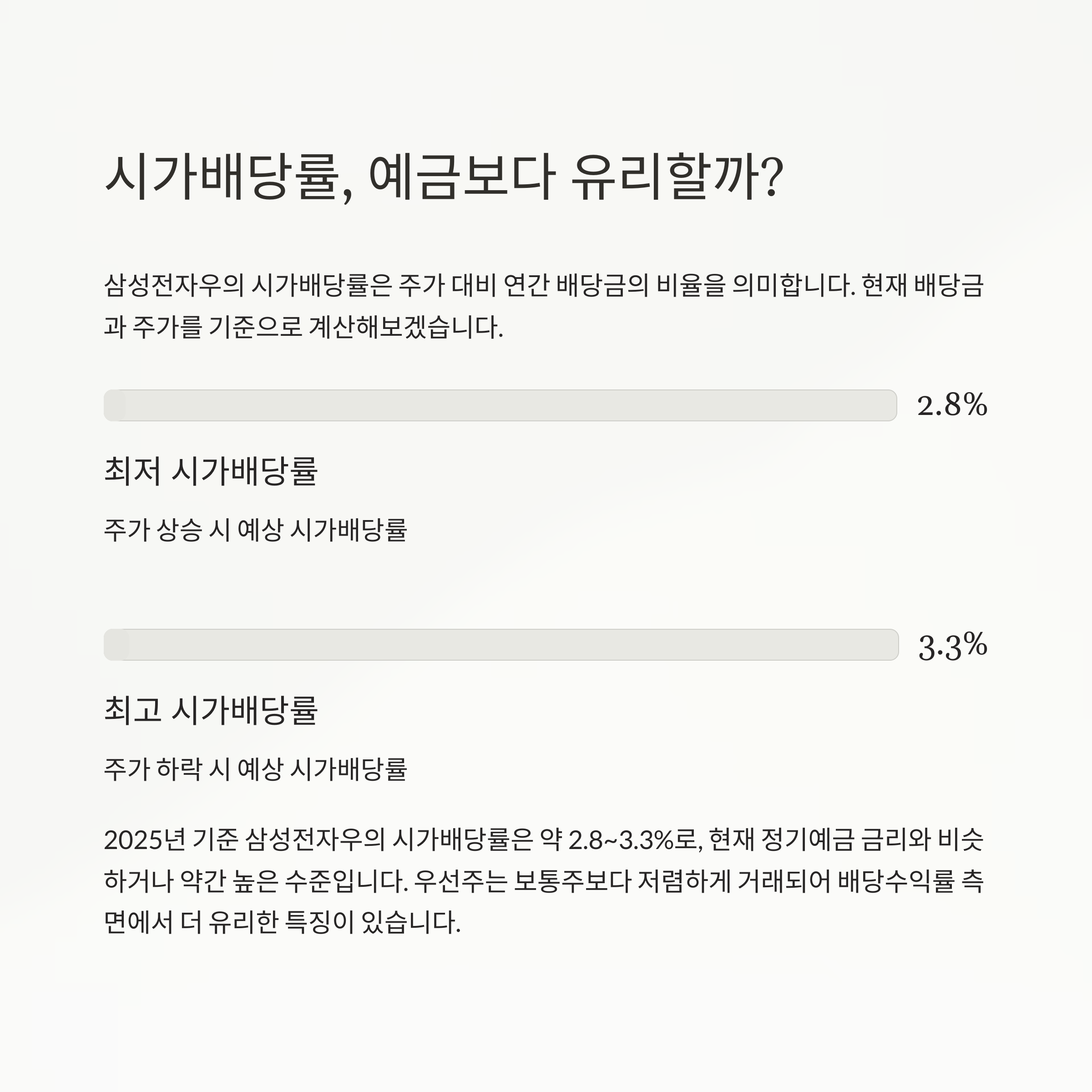 2025년 기준 시가배당률은 약 2.8%~3.3% 수준입니다.