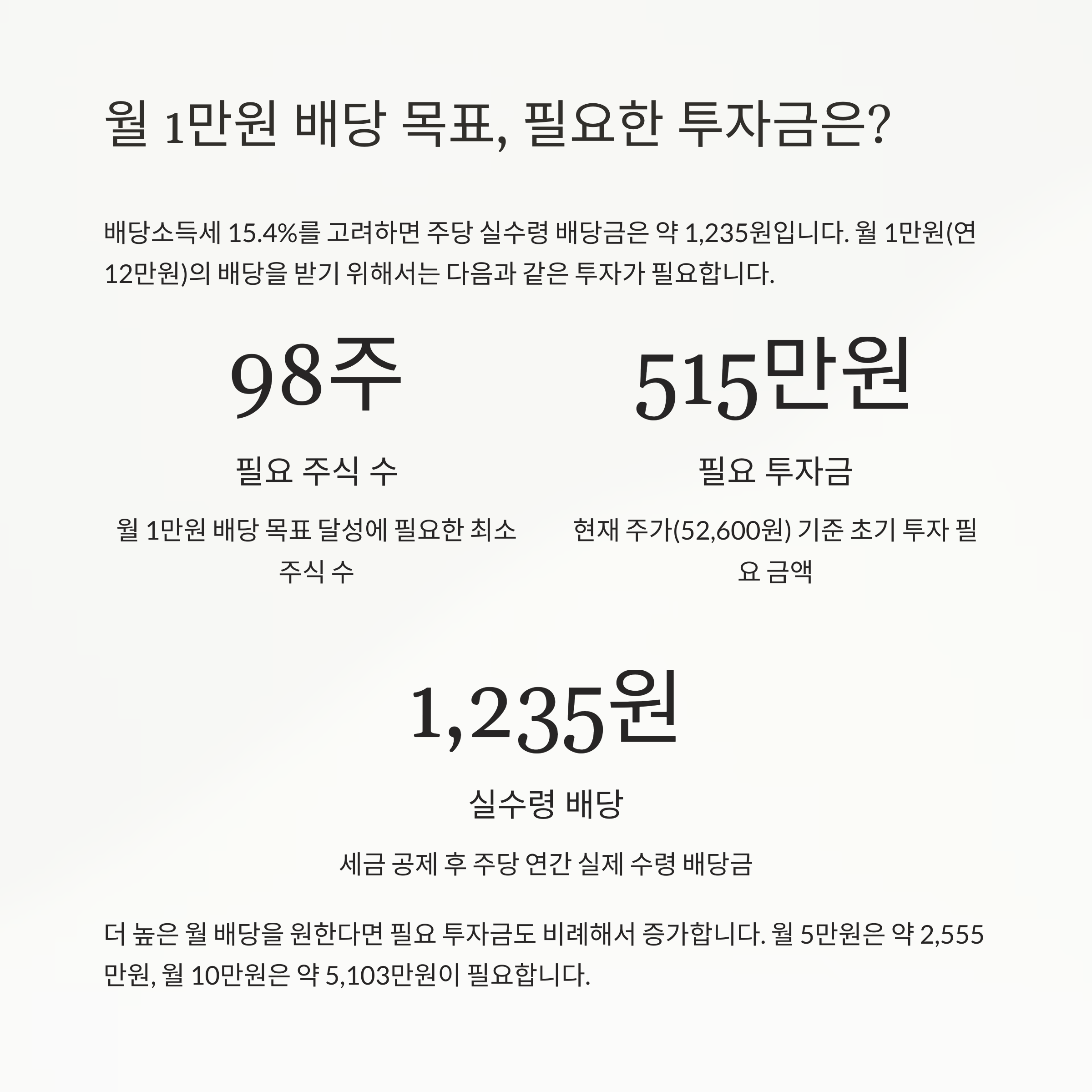 515만원 정도의 투자로 월 1만원의 실수령 배당 수익을 기대할 수 있습니다.